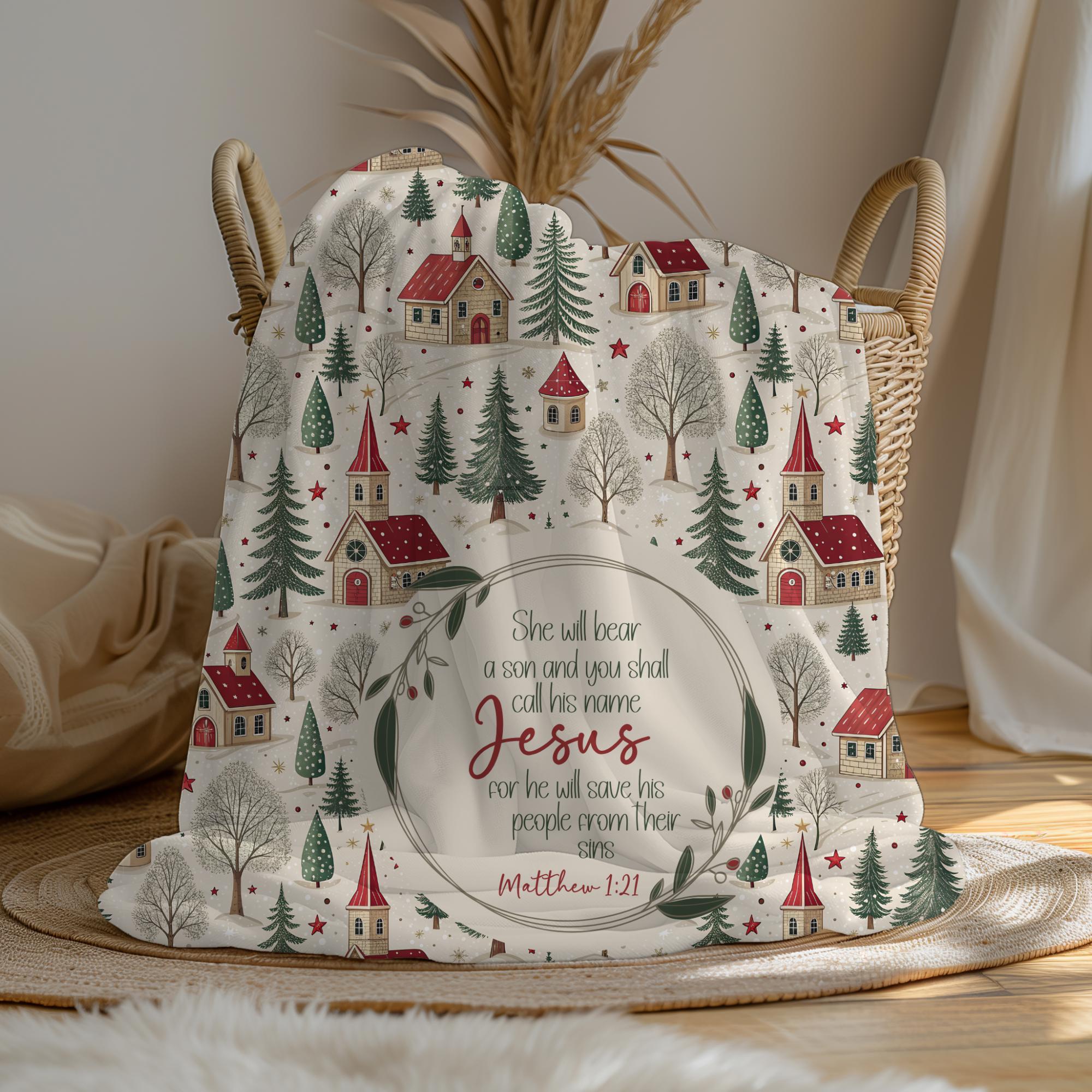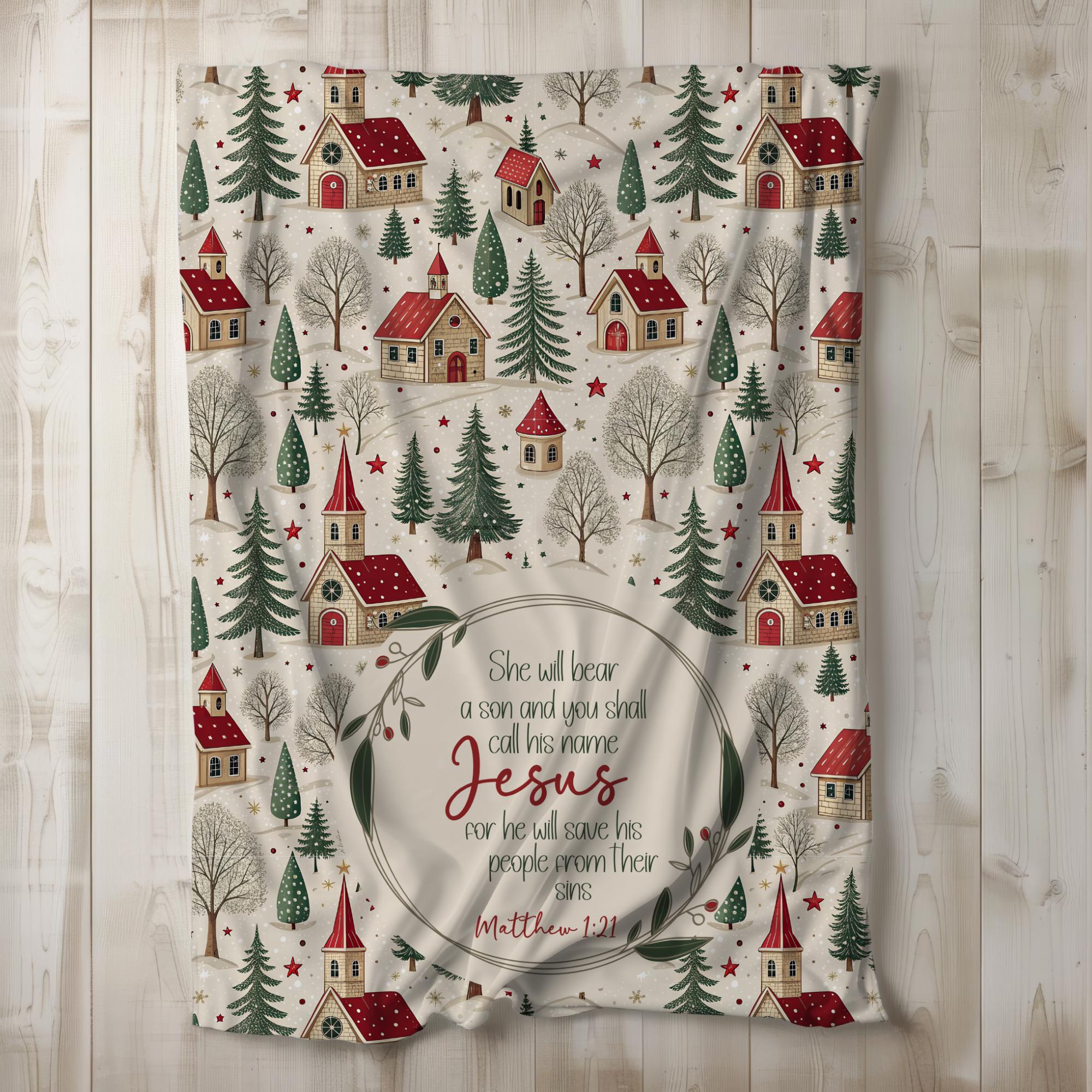 Matthew 1:21 Bible Verse Christmas Blanket with Town Scene | Faith Based Gift | Christian Holiday Decor
