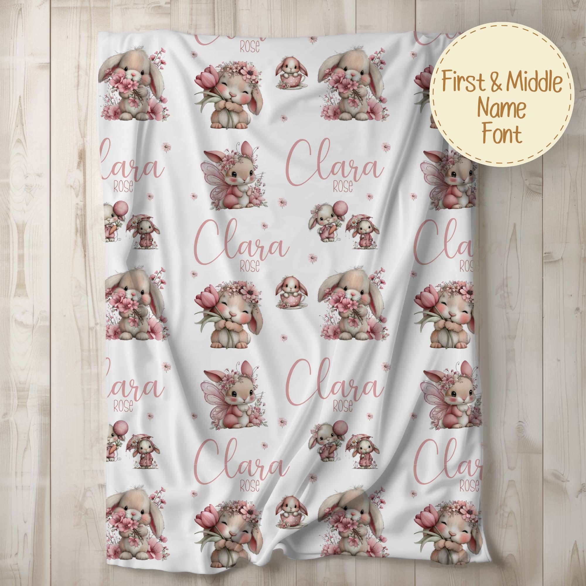 Personalized Baby Blanket with Whimsical Brown Bunnies and Pink Flowers | Custom Easter Blanket, Floral Bunny Nursery Decor, Girl Baby Gift