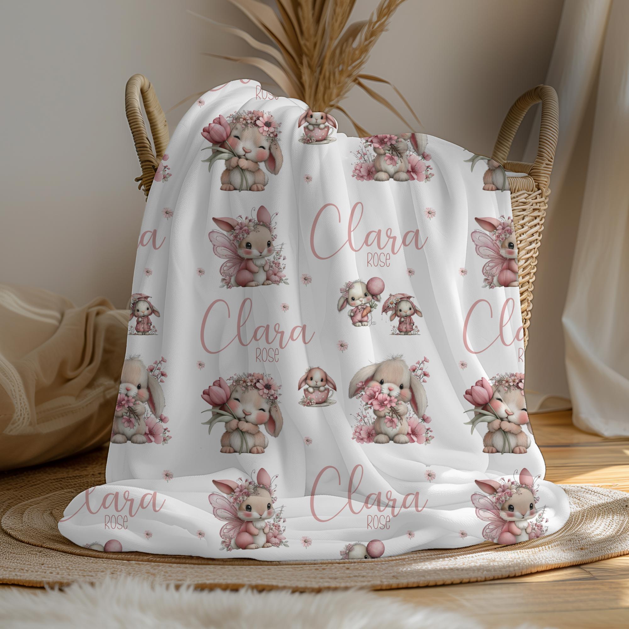 Celebrate springtime snuggles with this personalized baby blanket featuring whimsical brown bunnies surrounded by soft pink flowers. Perfect for Easter gifts, nursery decor, or everyday cuddles, this blanket blend cozy comfort with enchanting woodland charm.