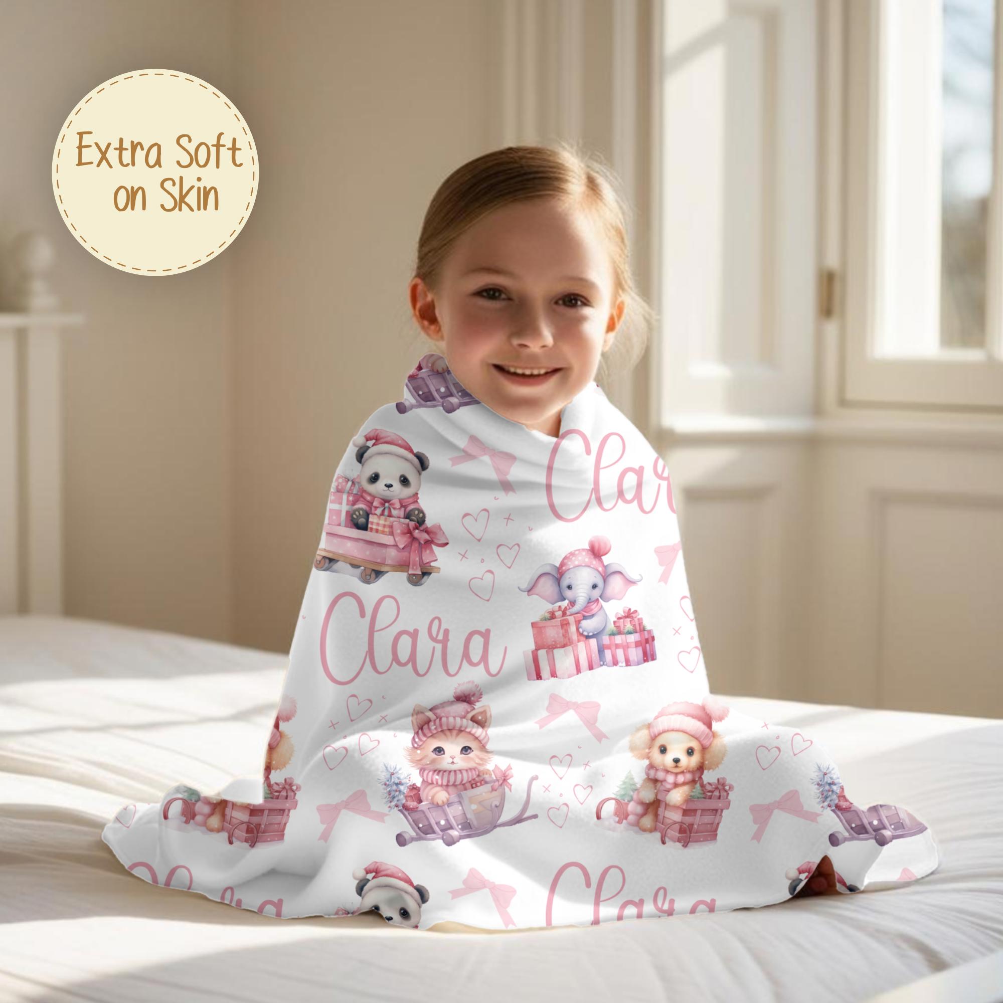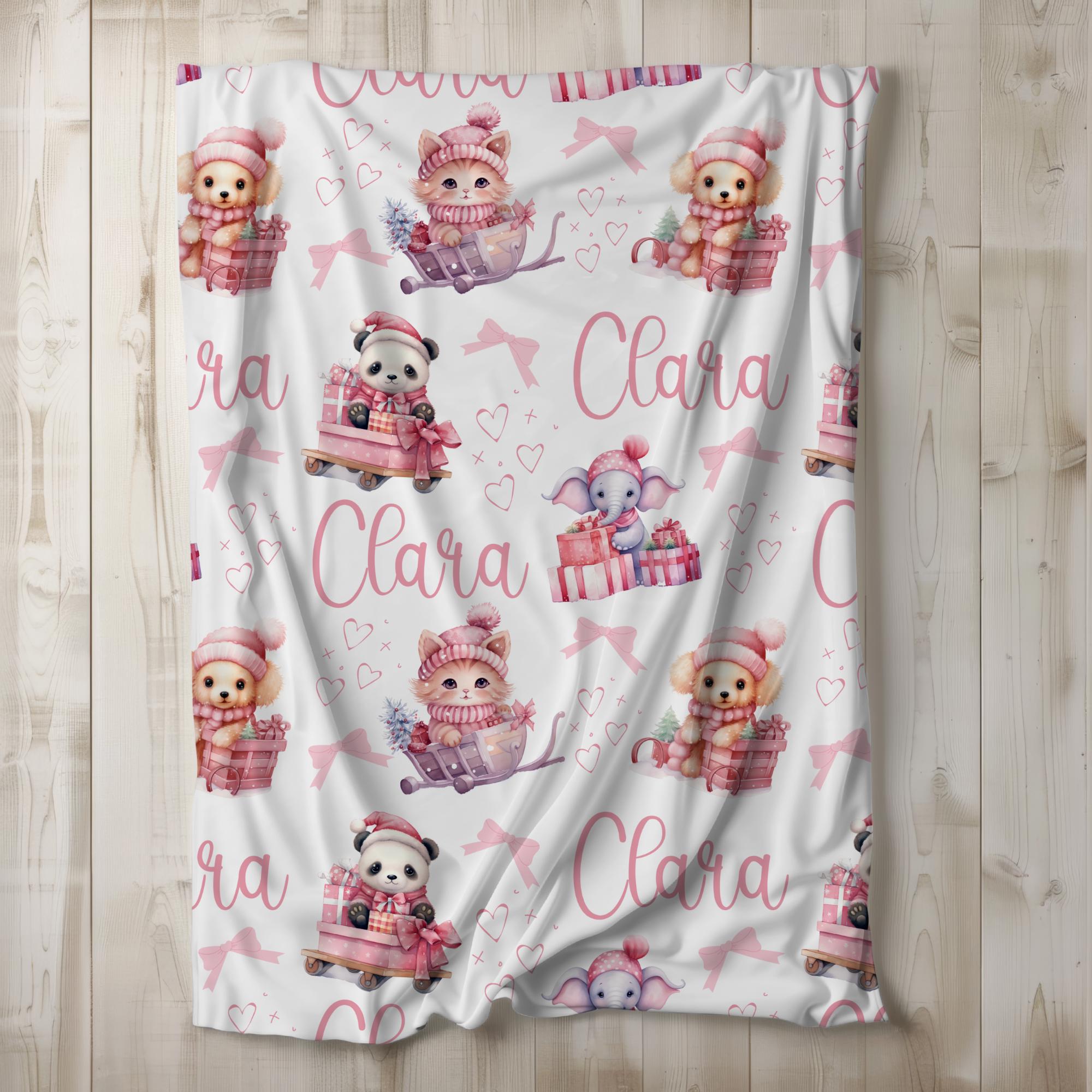 Wrap little ones in festive cheer with this adorable, personalized Christmas blanket! Featuring a delightful parade of baby animals—including a kitten, puppy, panda, and elephant—each cozily nestled in carts and surrounded by pink bows, hearts, Santa hats, and presents. This soft, custom blanket is the perfect holiday gift for girls and boys, adding a magical touch to any nursery or bedroom.