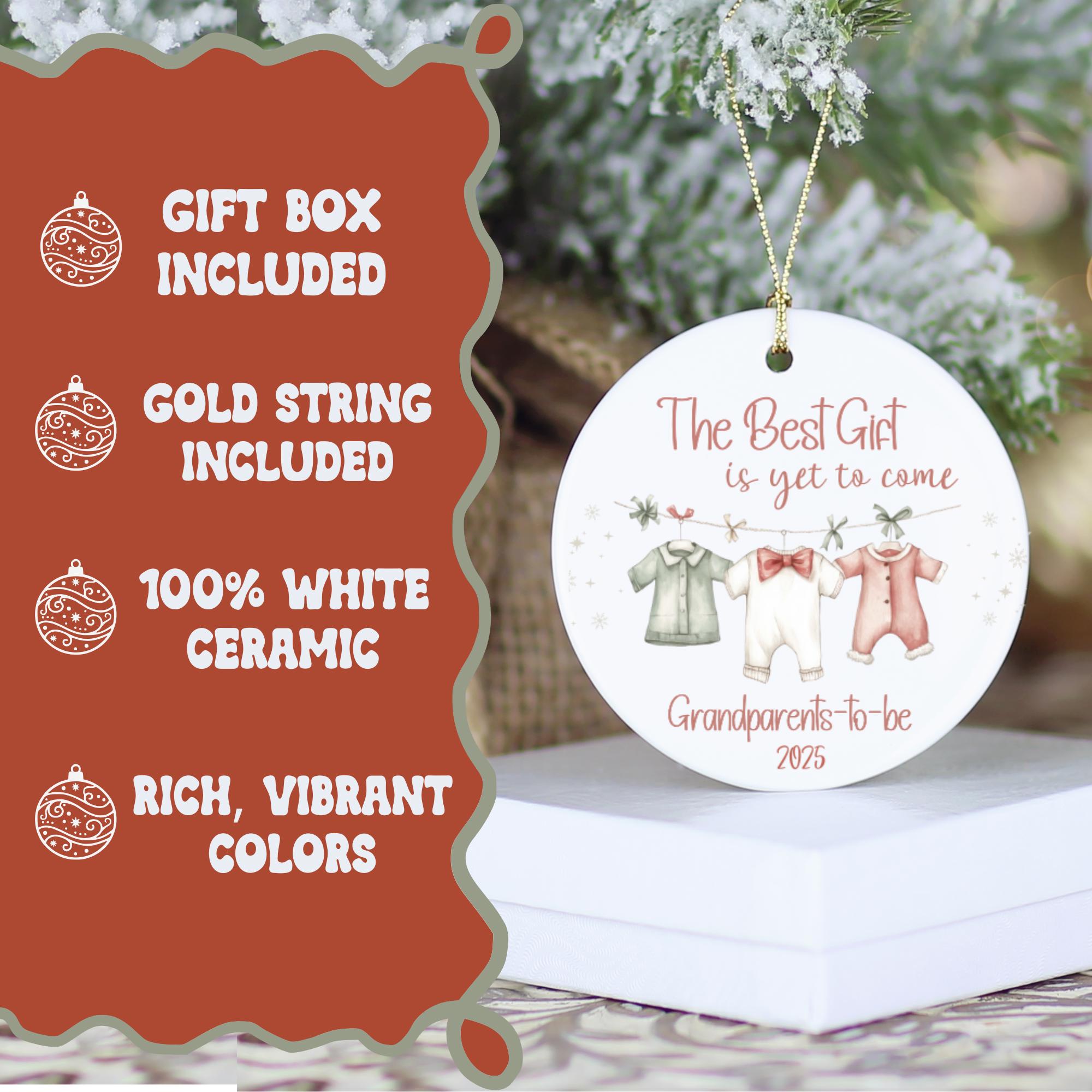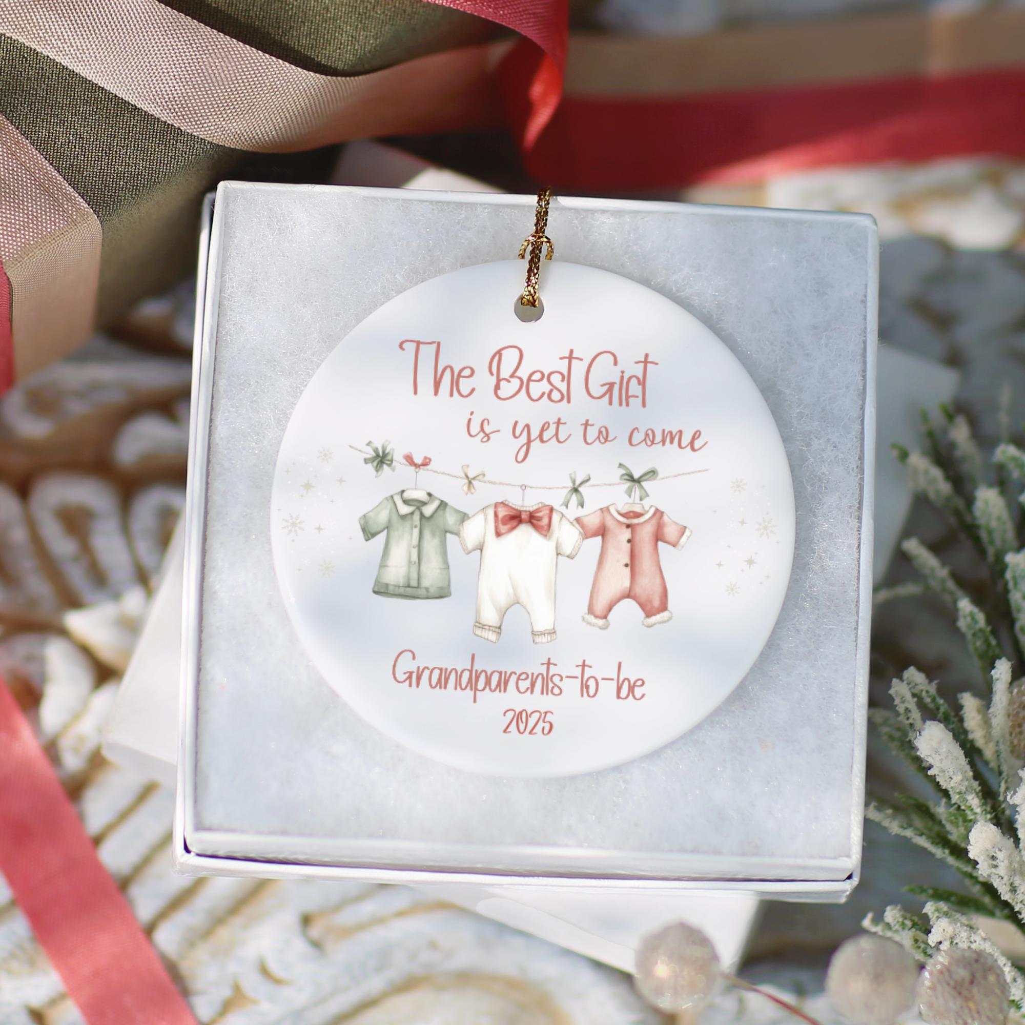 Celebrate the joy of becoming grandparents with this charming Christmas ornament, perfect for announcing a pregnancy or adding a heartfelt touch to the holiday tree. Each ornament features the sweet phrase “The Best Gift Is Yet to Come”, beautifully paired with a choice of adorable designs: baby clothes on a clothesline, a teddy bear, a baby reindeer, a stroller, or a baby resting on the moon.