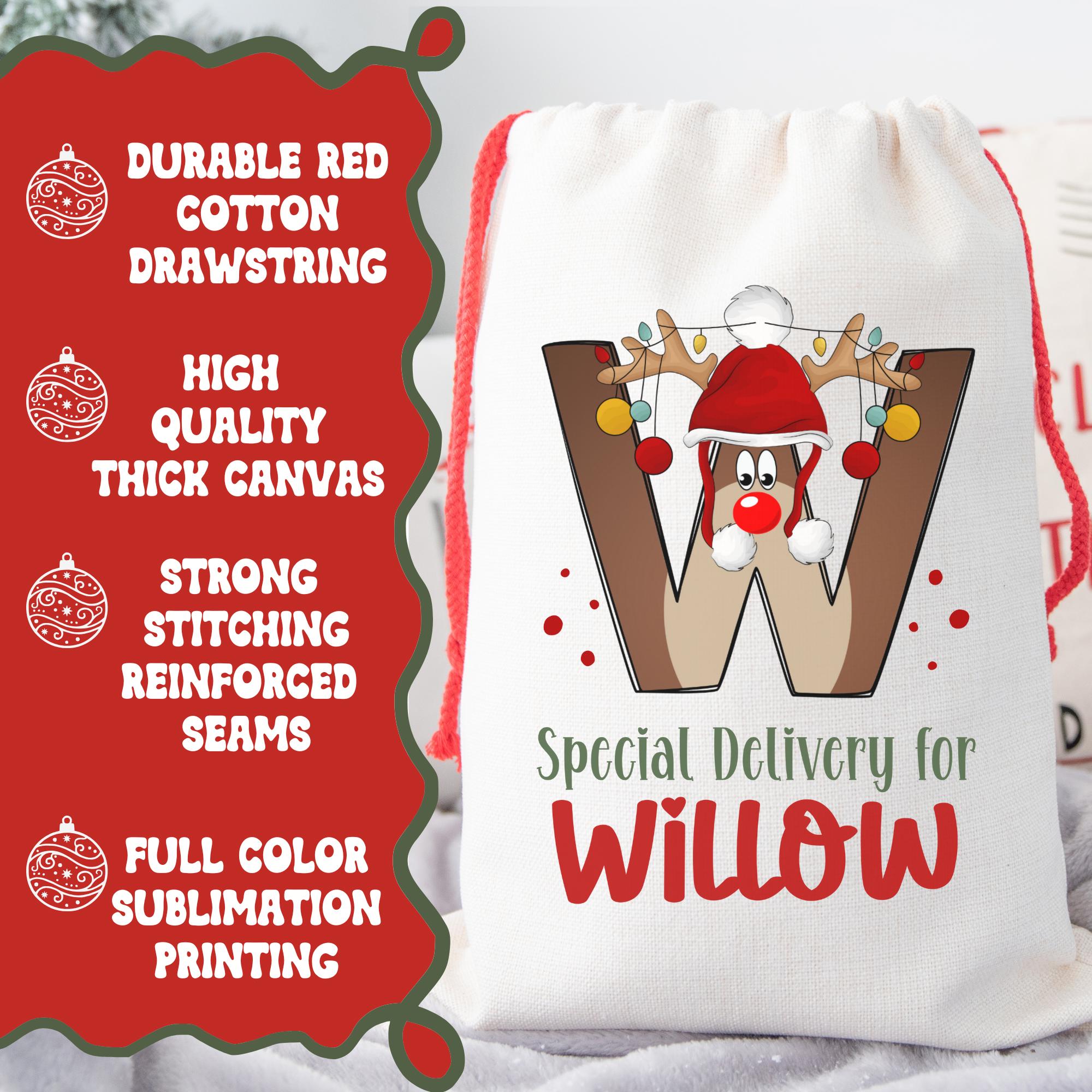 Personalized Rudolph Initial Special Delivery Santa Bag; Child's Fabric Christmas Gift Bag with Child’s Initial & Name; Large and Small Bags