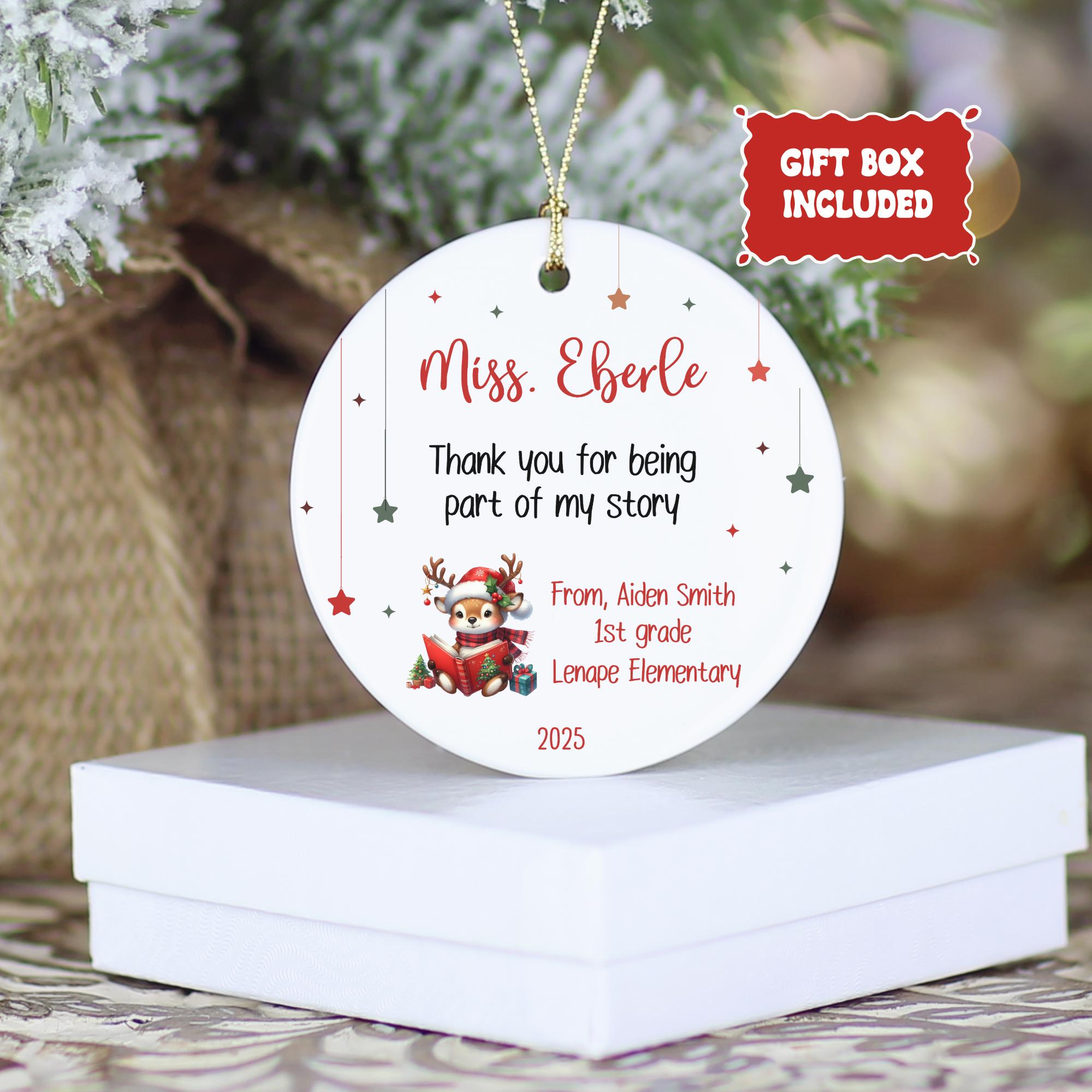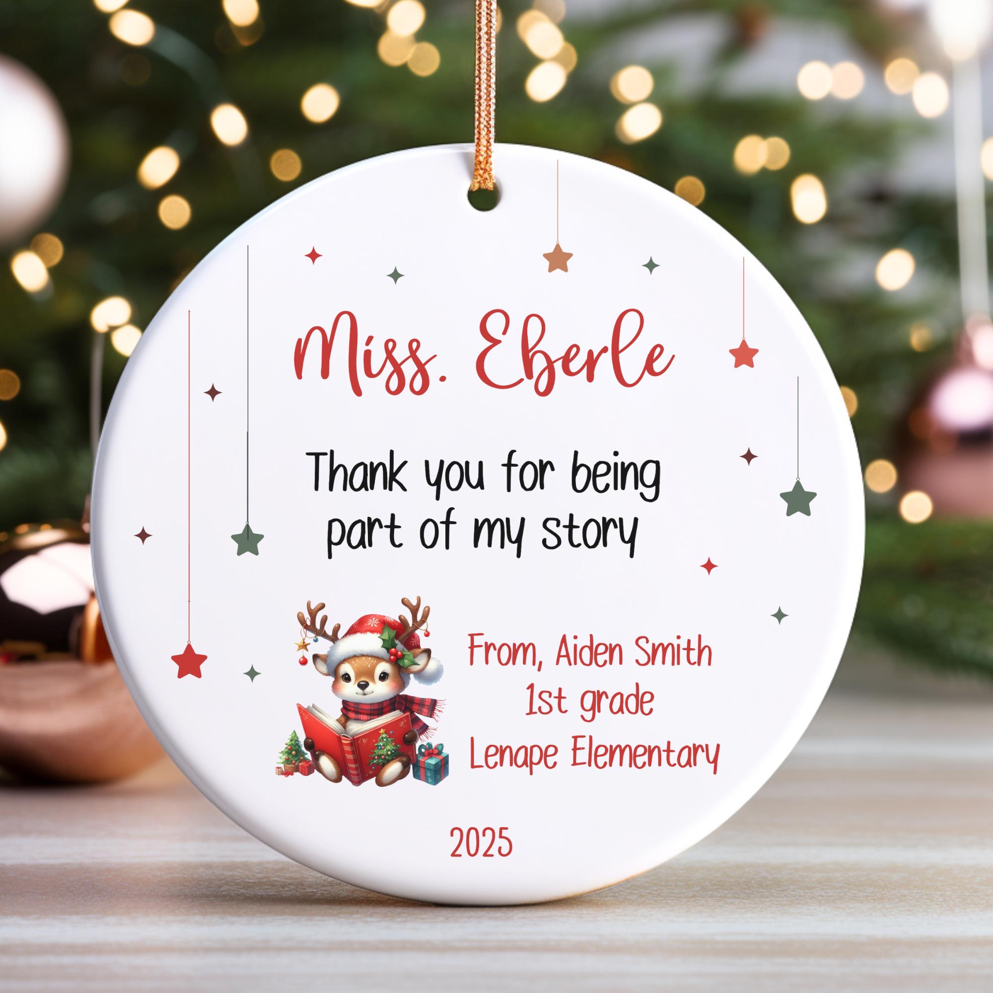 Celebrate a special teacher this holiday season with a personalized Christmas ornament that expresses heartfelt gratitude. This custom ornament features the teacher’s name and the touching message, “Thank you for being part of my story,” beautifully displayed above a charming illustration of Christmas books. The ornament is signed with the student’s name and grade, making it a unique keepsake your teacher will treasure for years to come.