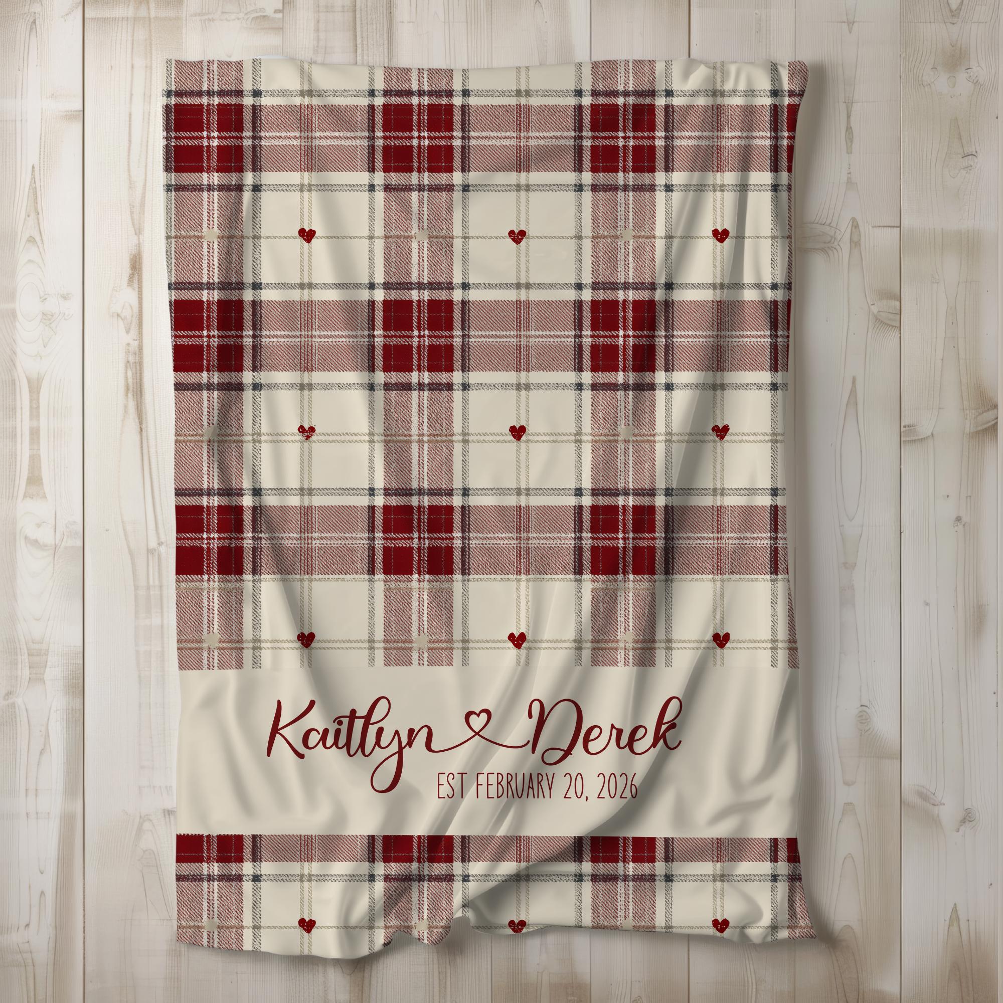 Personalized Valentine Blanket for Couples | Custom Names with Heart & Established Date | Cream with Red Plaid