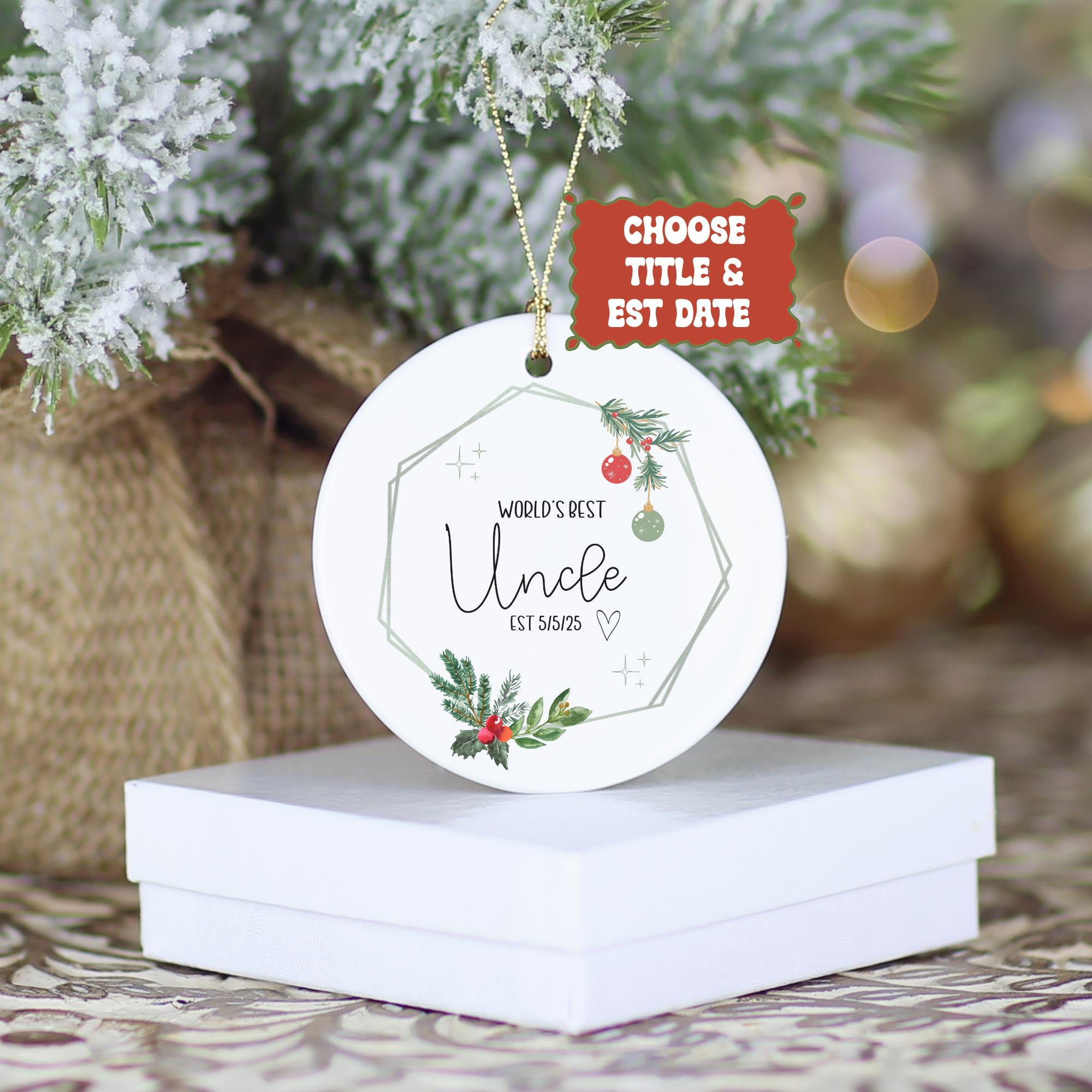 Celebrate the holiday season with a heartfelt keepsake that will be treasured for years to come. This Personalized Round Ceramic Christmas Ornament features a timeless design with delicate pine branches and hanging ornaments, surrounding a sweet cursive font that reads World’s Best [Grandma, Grandpa, Aunt, Uncle, Daughter-in-Law, or any title of your choice]. Santa Hat available upon request.