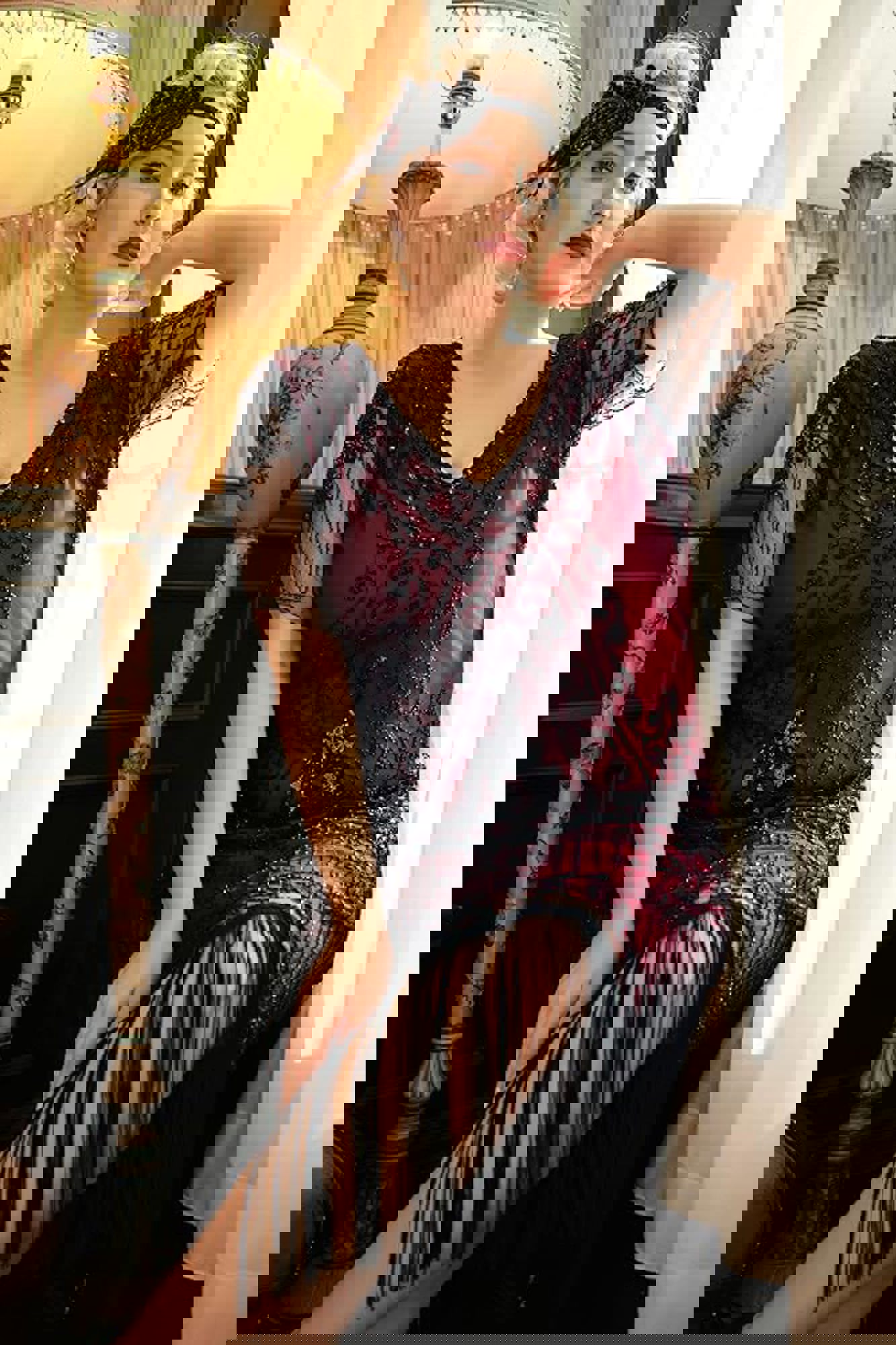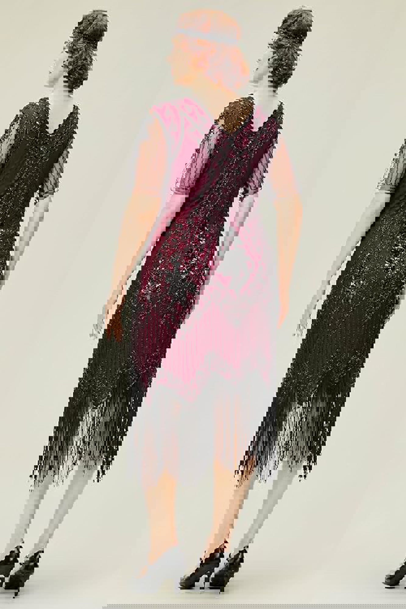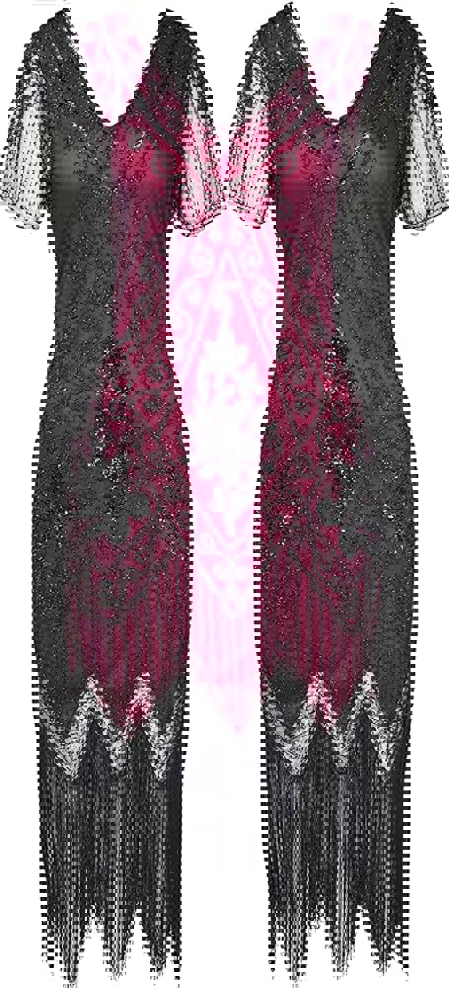 Turn heads at any event with this stunning plus size 1920s flapper dress, designed in a rich burgundy shade and embellished with intricate black beadwork. The shimmering sequins create an elegant vintage pattern that flatters curves beautifully, while the sheer beaded sleeves add a touch of glamour. Finished with a dramatic fringe hem that moves effortlessly with every step, this dress is perfect for Great Gatsby parties, cocktail events, holiday celebrations, and themed weddings. Crafted for comfort, confidence, and show-stopping style, it’s the perfect choice for anyone wanting a timeless, high-impact look.