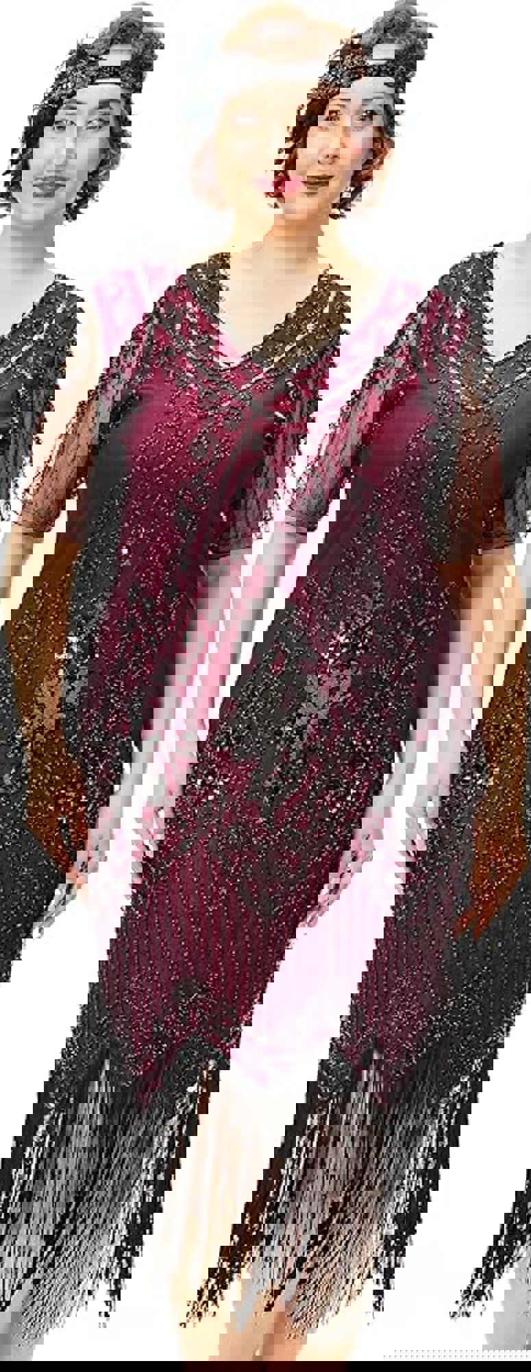 Plus Size 1920s Flapper Dress – Burgundy Sequin Beaded Fringe Cocktail Party Dress