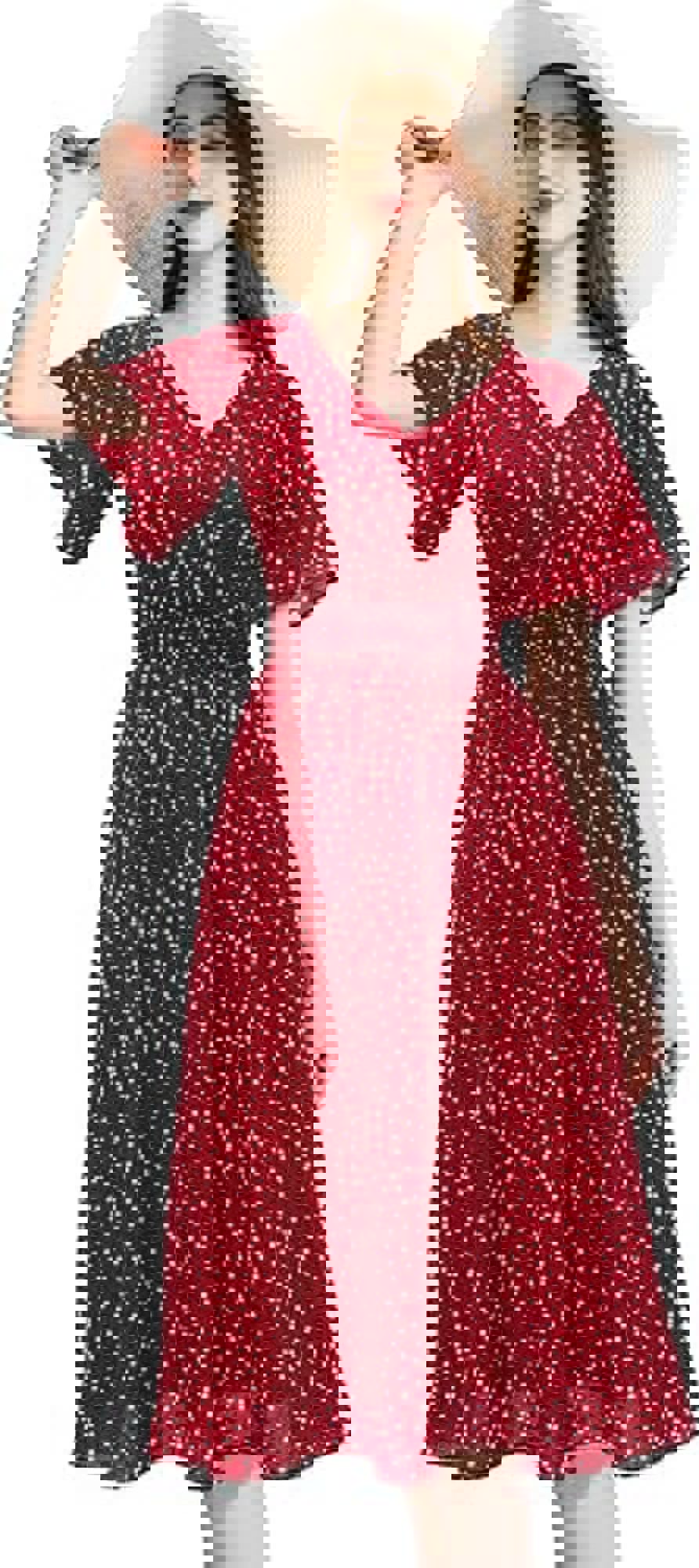 Add timeless charm to your wardrobe with this red polka dot midi dress for women. Designed with a flattering V-neckline, short flutter sleeves, and a cinched elastic waist, this dress creates a graceful silhouette that’s both comfortable and stylish. The lightweight, breathable fabric makes it perfect for summer days, vacations, picnics, or casual outings.
