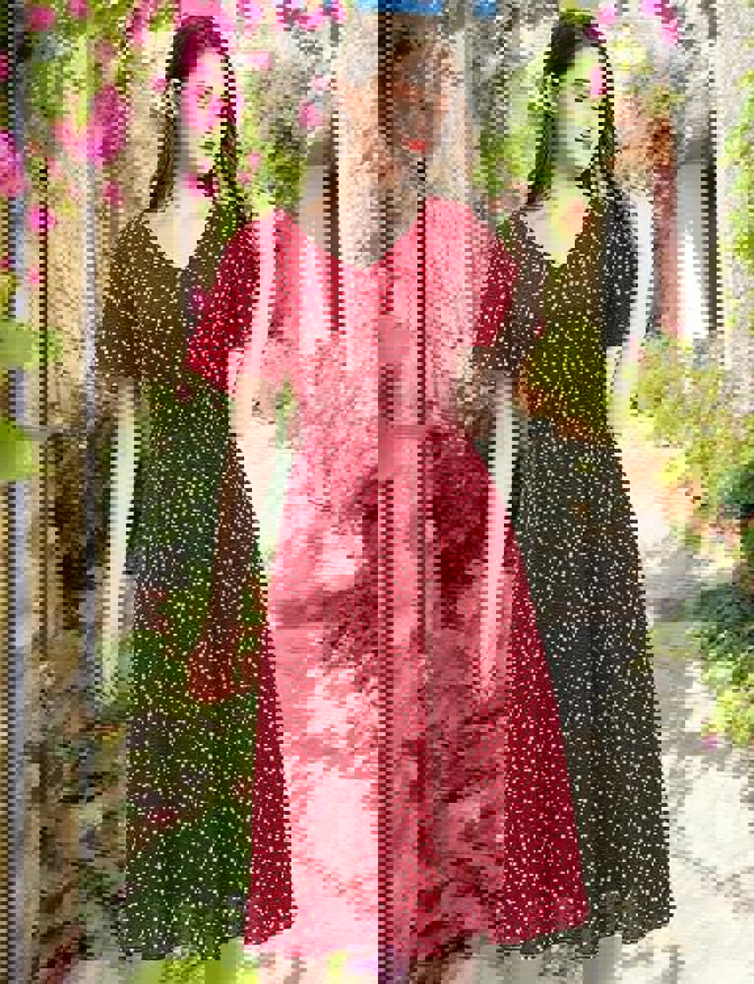 Women’s Red Polka Dot Midi Dress – V-Neck Short Sleeve Summer Dress, Flowy Casual A-Line Dress for Beach, Vacation & Everyday Wea