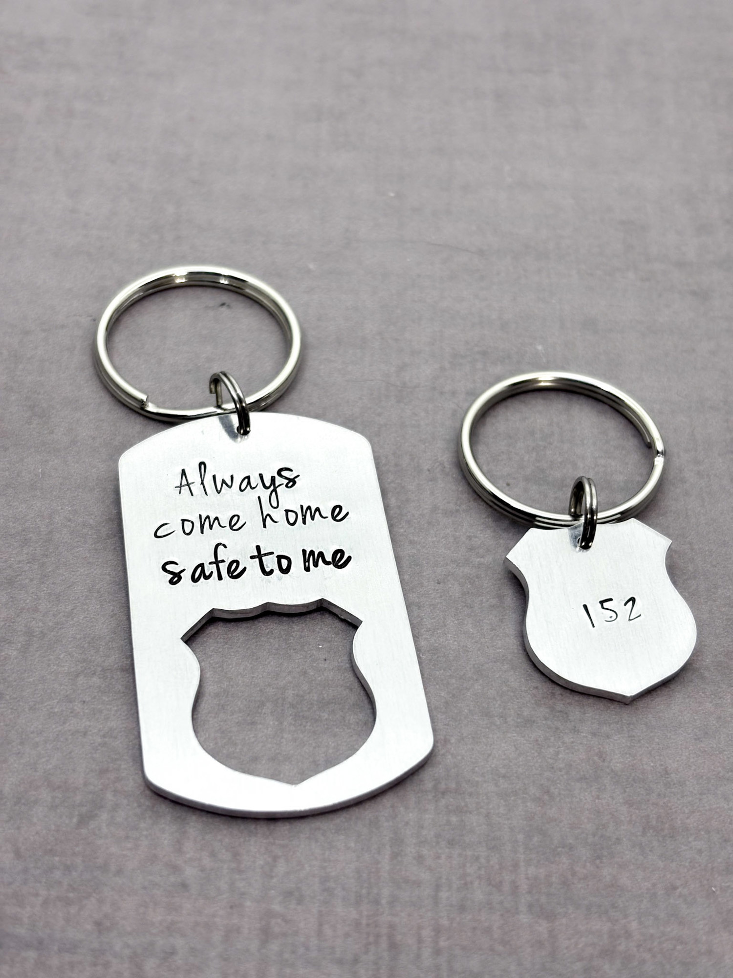 This hand-stamped Police Officer keychain set is a sentimental reminder to stay safe and come home. Each set includes: