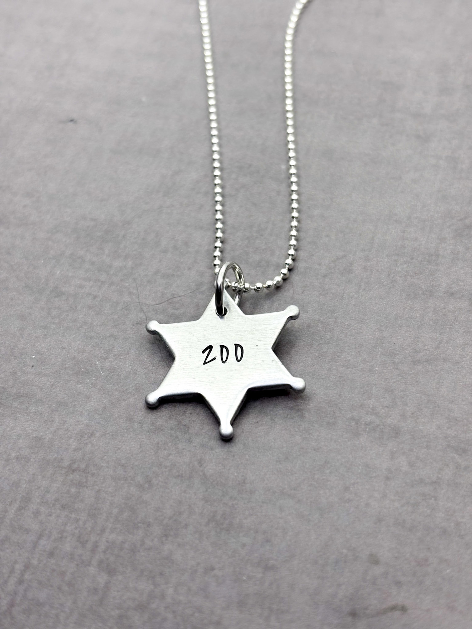 • Mini sheriff star badge charm personalized with a name, badge number, or short text