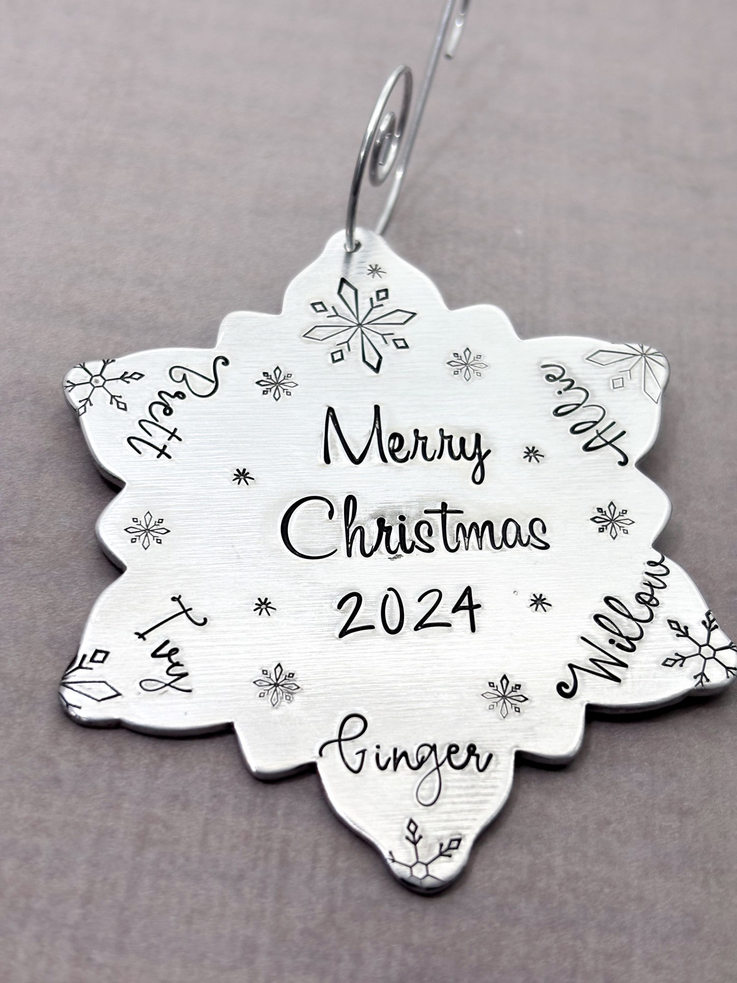 Celebrate your family’s story with a personalized Christmas ornament designed to shine. This snowflake-shaped keepsake is hand stamped with your names and year, turning your tree into a meaningful memory.