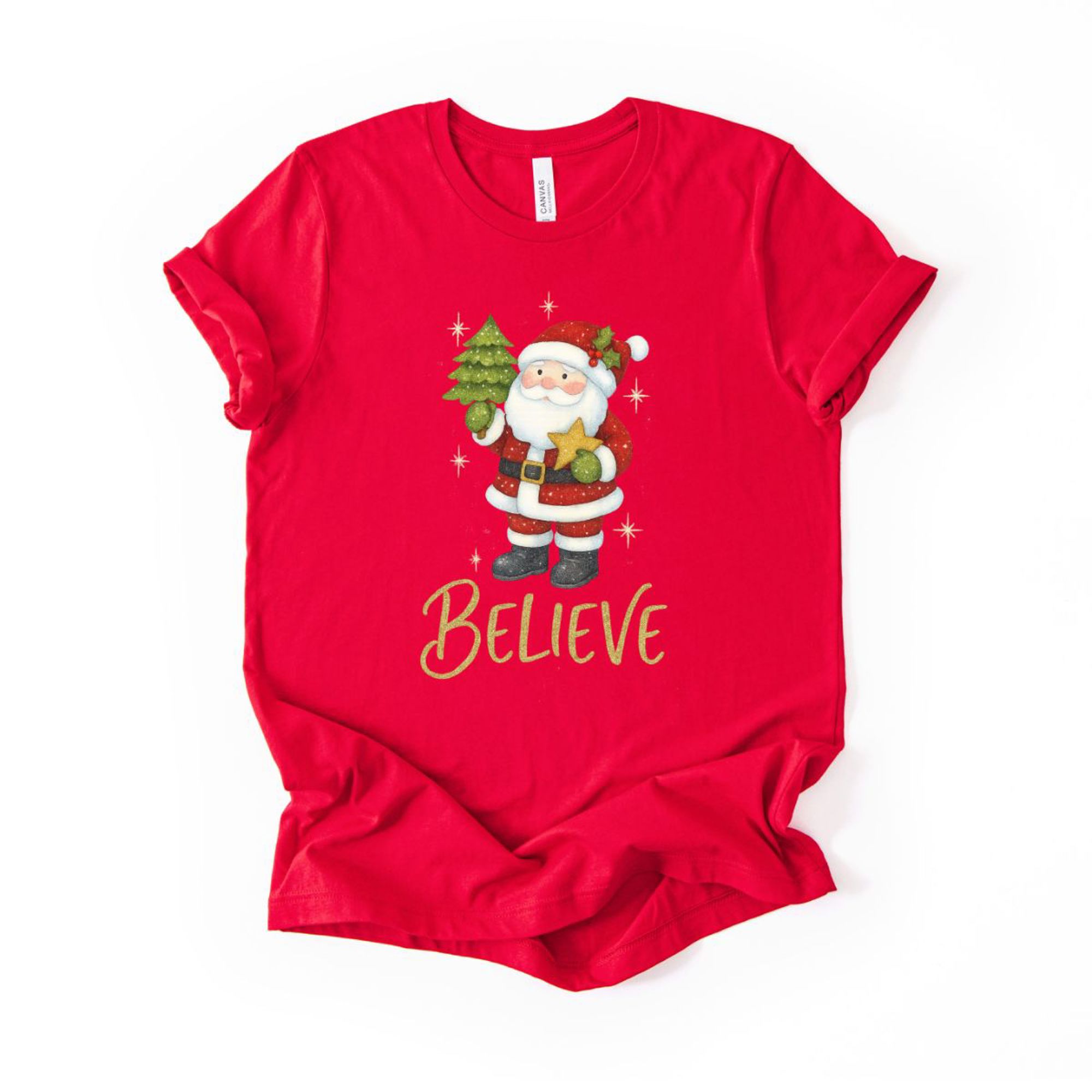 Believe Christmas Santa With Star and Tree - Soft and Comfy Bella Canvas T-Shirt