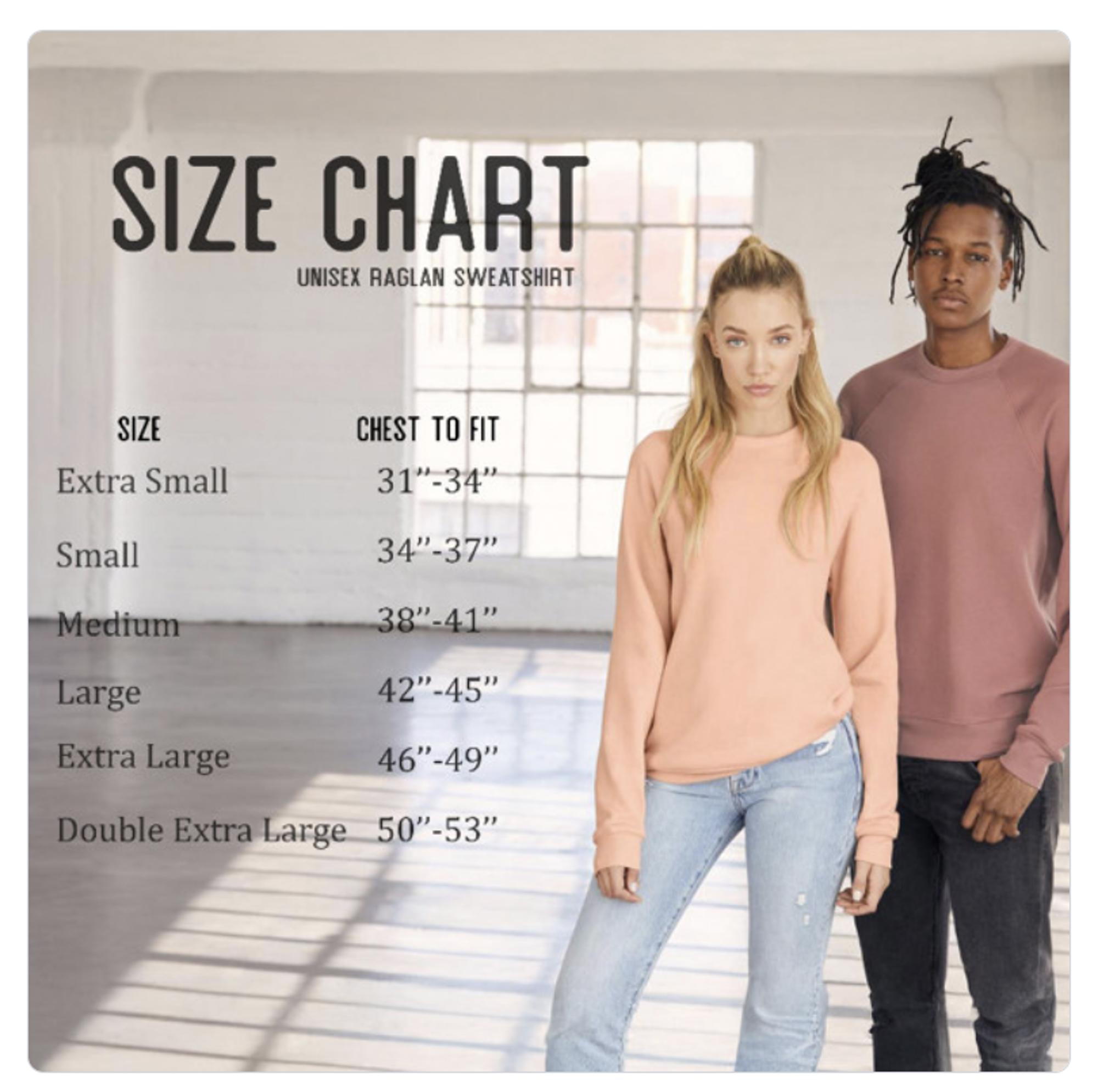 • Sweatshirt (Crewneck) | Sponge Fleece Raglan (Unisex) | Bella Canvas: 8 oz./yd² (US) 13.4 oz./L yd (CA), (Solid & Heather) 52/48 Airlume combed and ring-spun cotton/polyester, 32 singlesAthletic Heather is 90/10 Airlume combed and ring-spun cotton/ polyester fleeceTriblends are 8.2 oz./yd², 50/37.5/12.5 polyester/Airlume combed and ring-spun cotton/rayonBlack Heather is 85/15 Airlume combed and ring-spun cotton/polyesterNavy Heather is 60/40 Airlume combed and ring-spun cotton/polyesterMarbles are 6.5 oz./yd², 85/15 Airlume combed and ring-spun cotton/polyesterGrey Acid Wash is 8 oz./yd², 52/48 Airlume combed and ring-spun cotton/polyesterPre-shrunkRetail fitUnisex sizing Ribbed cuffs and waistbandSide seamsTear away label