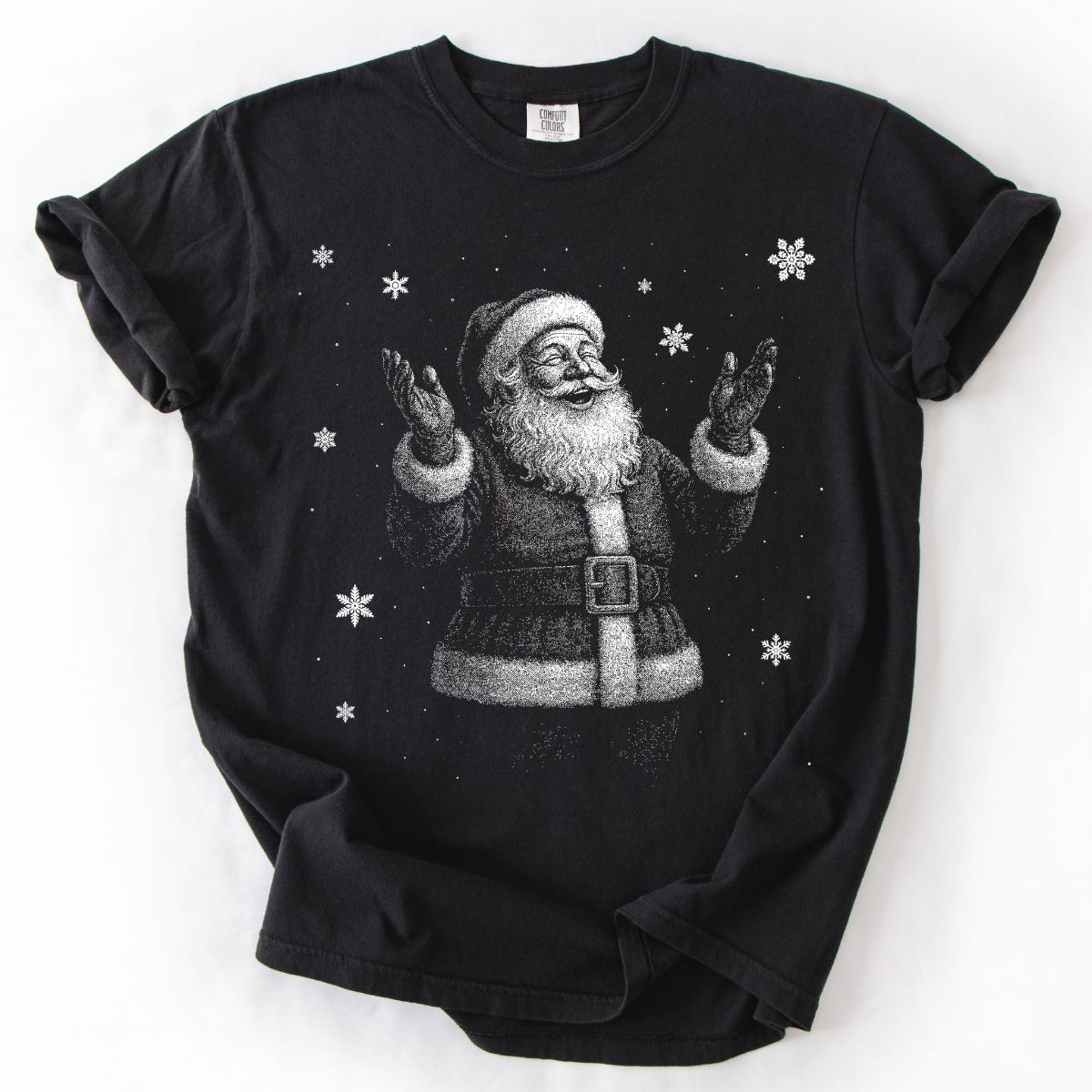 Jolly Christmas Santa In The Snow Half Tone Style Print - T-Shirt (Crewneck) 100 Cotton Heavyweight Tee (Unisex) Comfort Colors