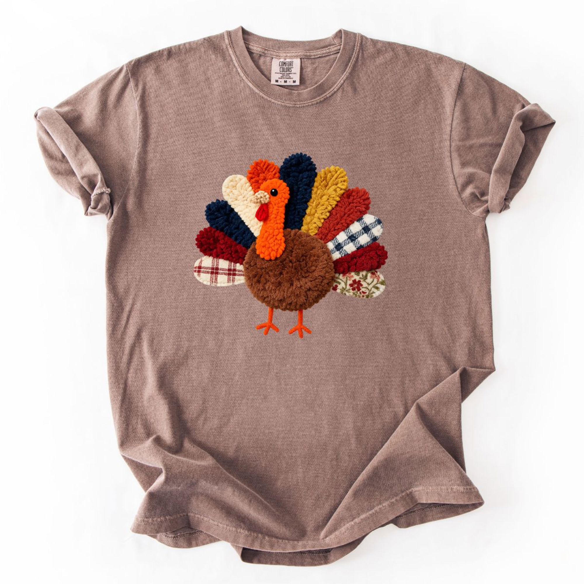 Faux (PRINTED) Latch Hook Rug Style Turkey For Thanksgiving - T-Shirt (Crewneck) 100 Cotton Heavyweight Tee (Unisex) Comfort Colors