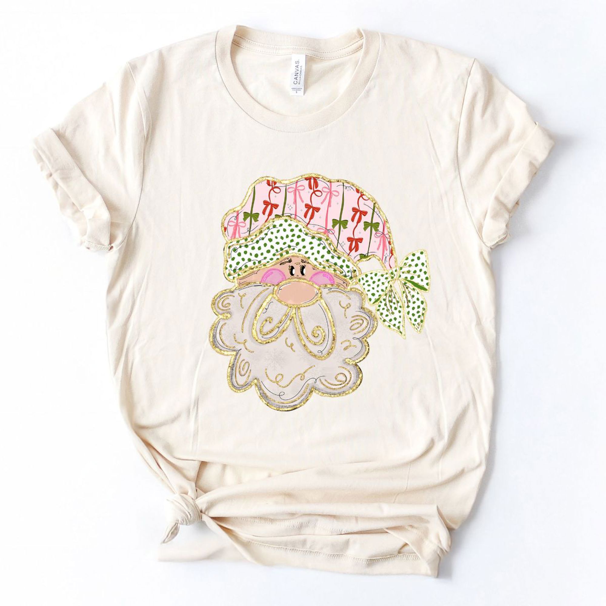 Preppy Bow Santa Claus With Faux Glitter Accents - T-Shirt (Crewneck) 100 Cotton Solid Colors Jersey Tee (Unisex) Bella Canvas, T-Shirt (Crewneck) Poly-C