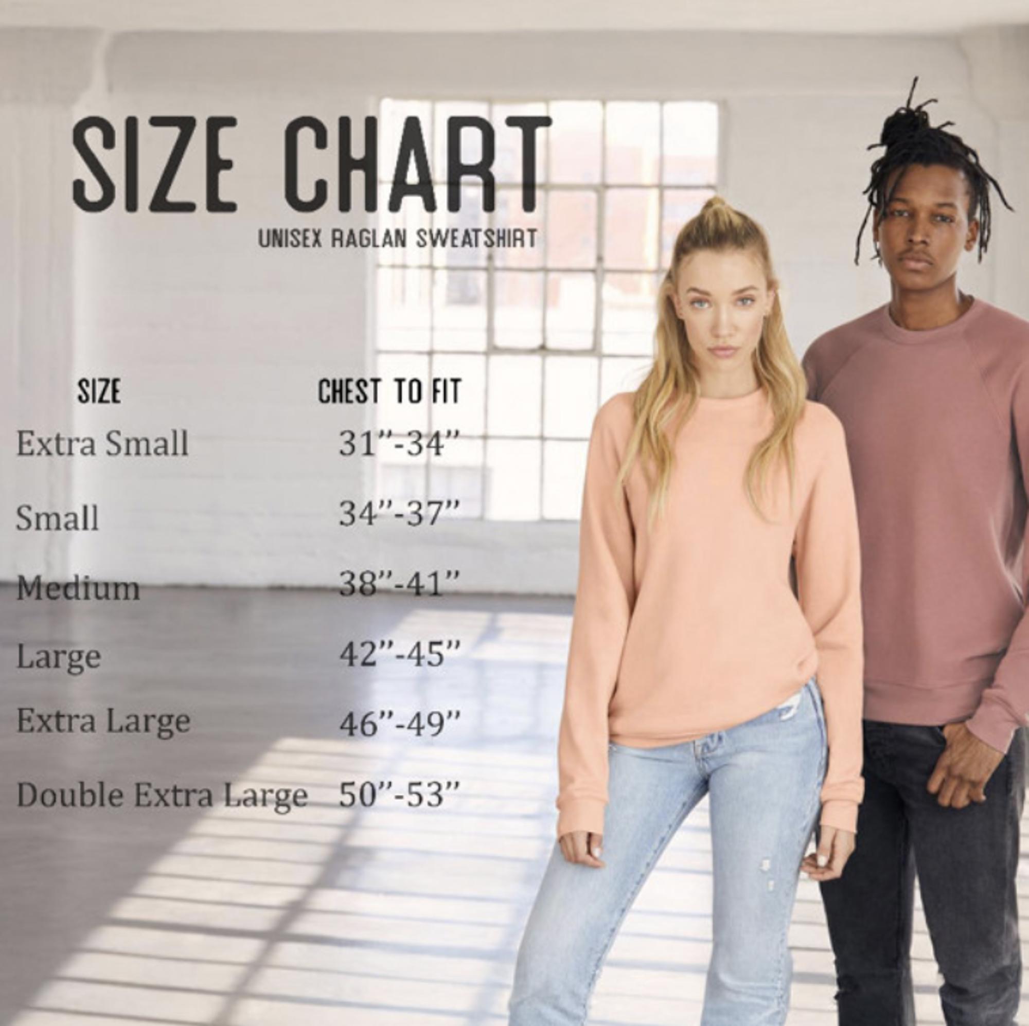 • Sweatshirt (Crewneck) | Sponge Fleece Raglan (Unisex) | Bella Canvas: 8 oz./yd² (US) 13.4 oz./L yd (CA), (Solid & Heather) 52/48 Airlume combed and ring-spun cotton/polyester, 32 singlesAthletic Heather is 90/10 Airlume combed and ring-spun cotton/ polyester fleeceTriblends are 8.2 oz./yd², 50/37.5/12.5 polyester/Airlume combed and ring-spun cotton/rayonBlack Heather is 85/15 Airlume combed and ring-spun cotton/polyesterNavy Heather is 60/40 Airlume combed and ring-spun cotton/polyesterMarbles are 6.5 oz./yd², 85/15 Airlume combed and ring-spun cotton/polyesterGrey Acid Wash is 8 oz./yd², 52/48 Airlume combed and ring-spun cotton/polyesterPre-shrunkRetail fitUnisex sizing Ribbed cuffs and waistbandSide seamsTear away label