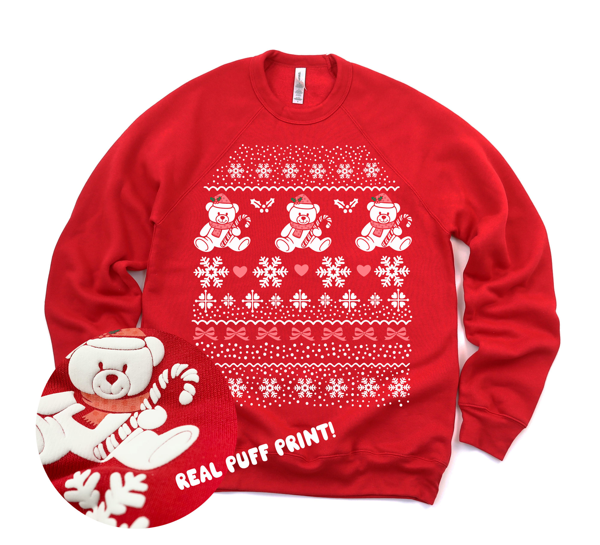 PUFF Print Christmas Teddies With Color Accents - Sweatshirt (Crewneck) Sponge Fleece Raglan (Unisex) Bella Canvas
