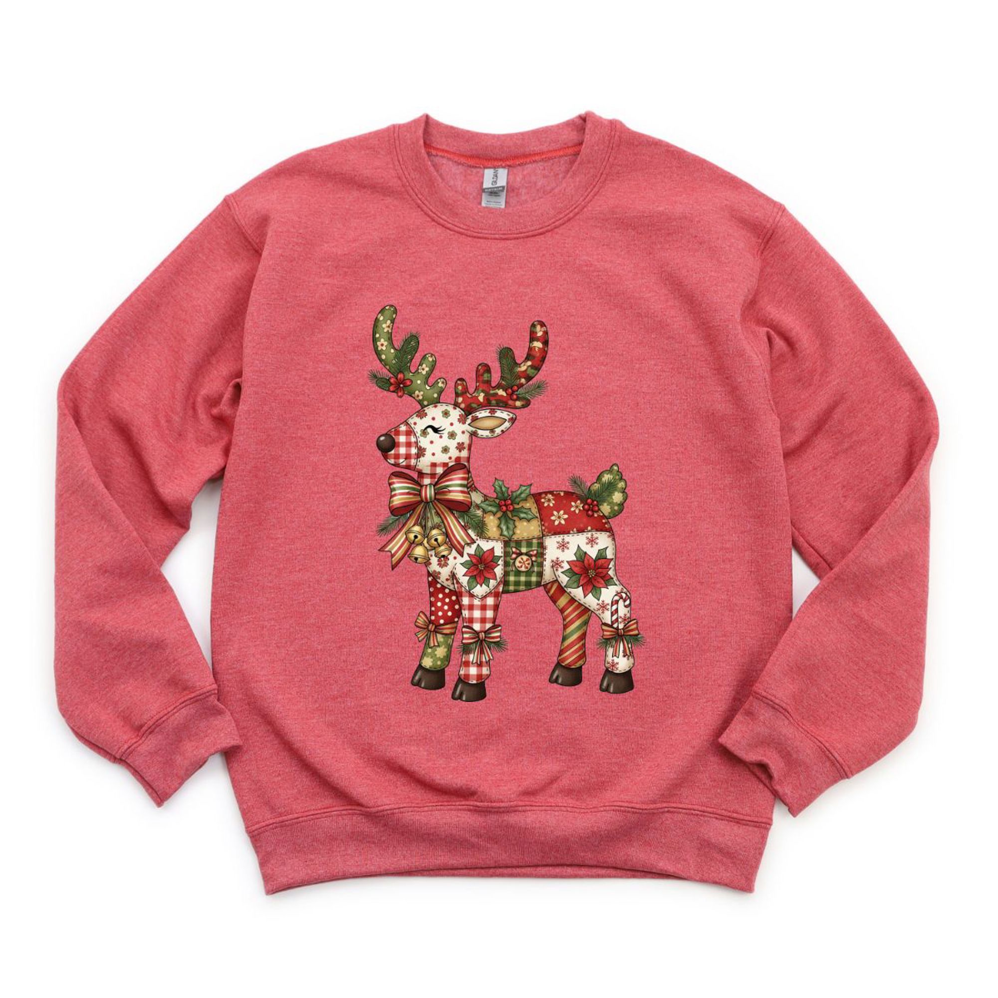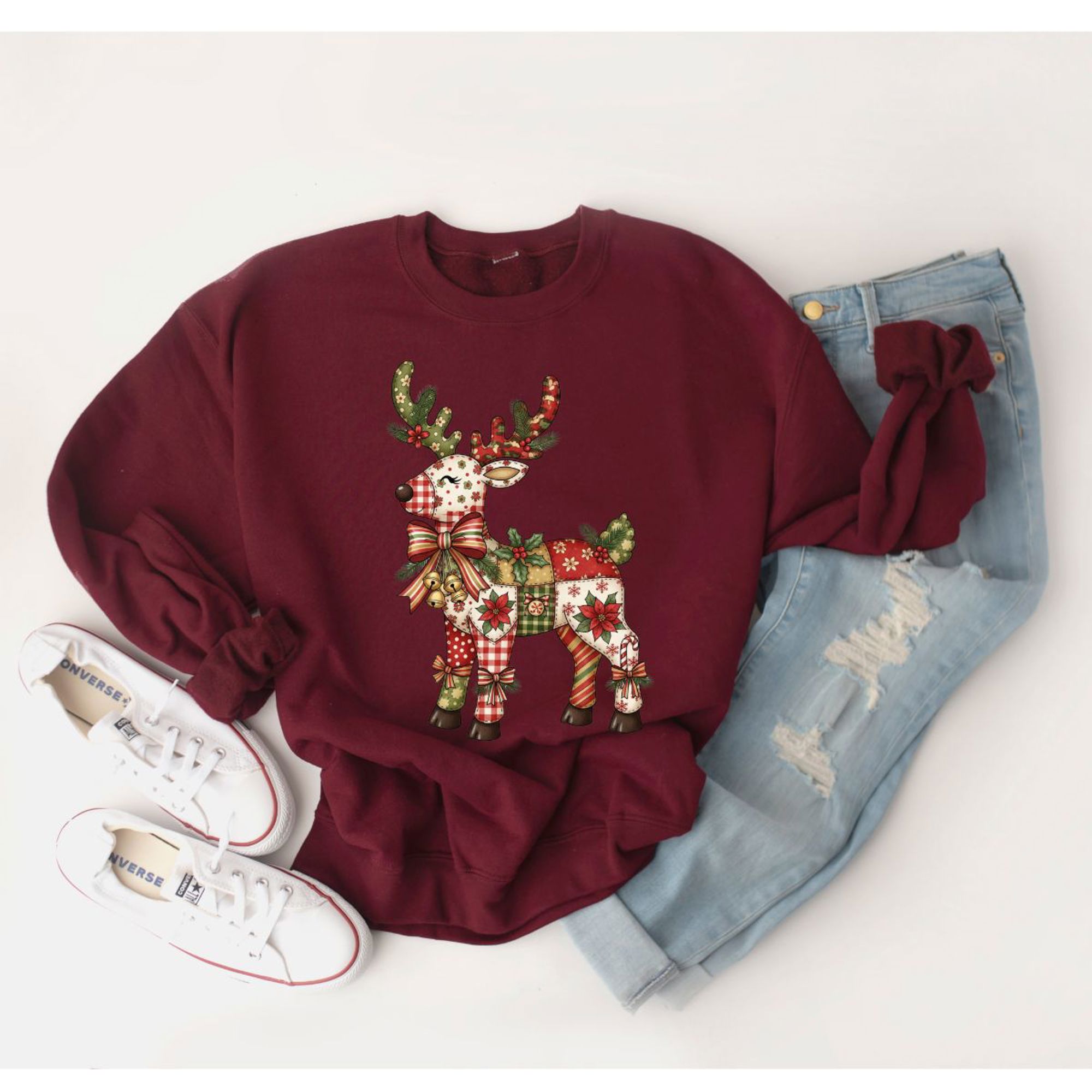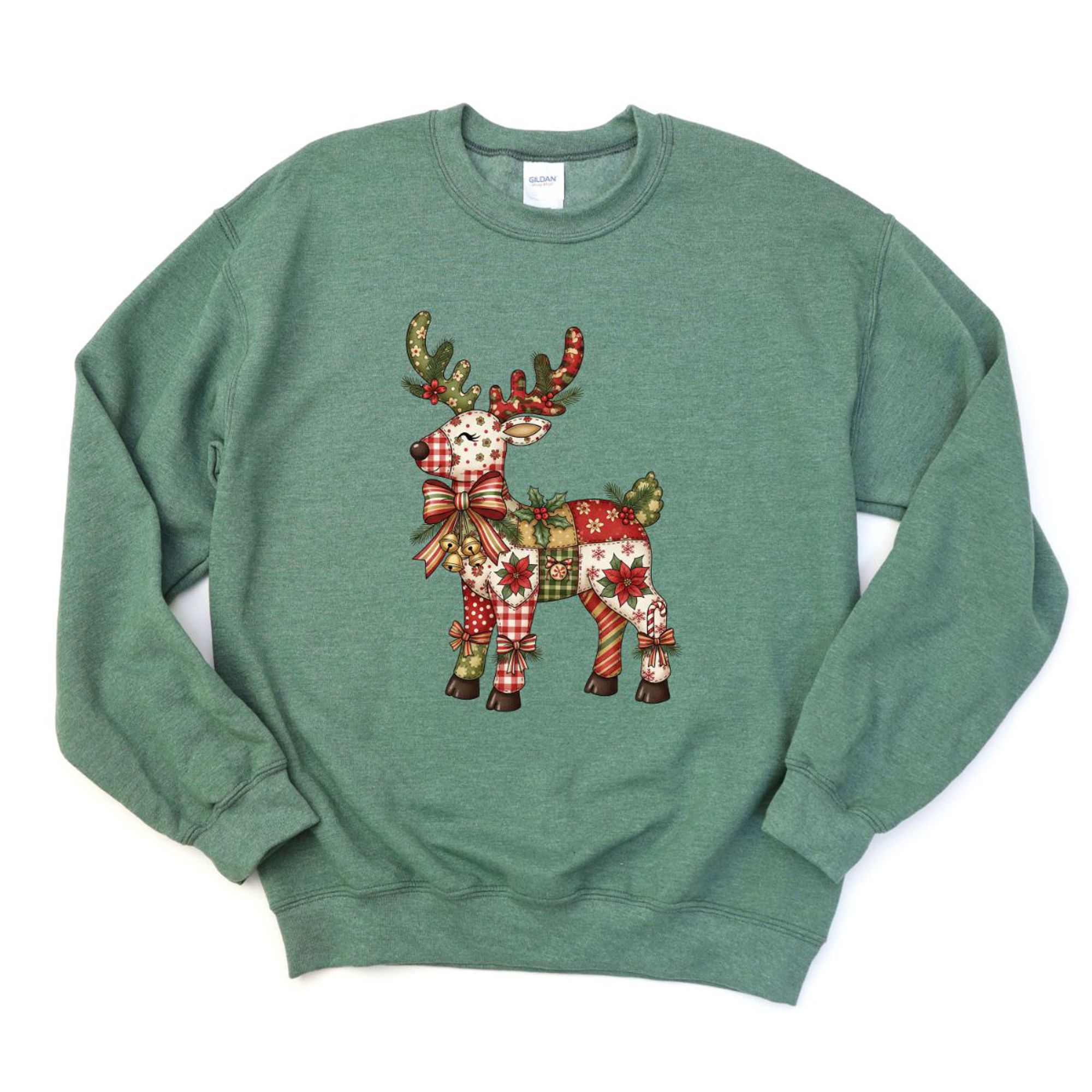 Quilted Folk Art Christmas Reindeer Printed - Comfy Drop Shoulder Sweatshirt
