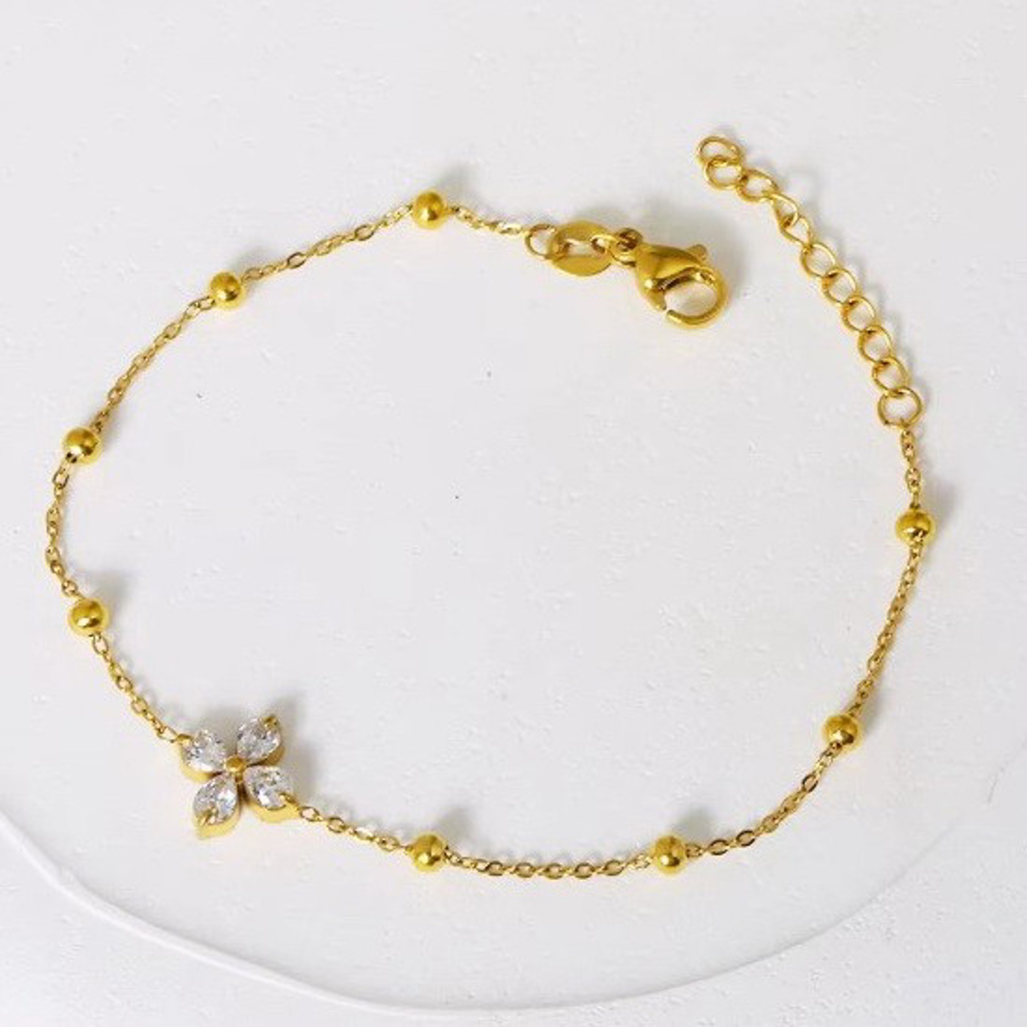 18K Dipped Stainless Steel Non-Tarnish Classic Gemstone Bracelet, this bracelet features a beautiful gemstone on a station ball chain design crafted from premium 18K stainless steel. Its non-tarnish finish ensures lasting shine and durability, making it perfect for everyday elegance or layering with other pieces. Pair it with our " 18k Stainless Steel Tarnish Free Stud Earrings"
