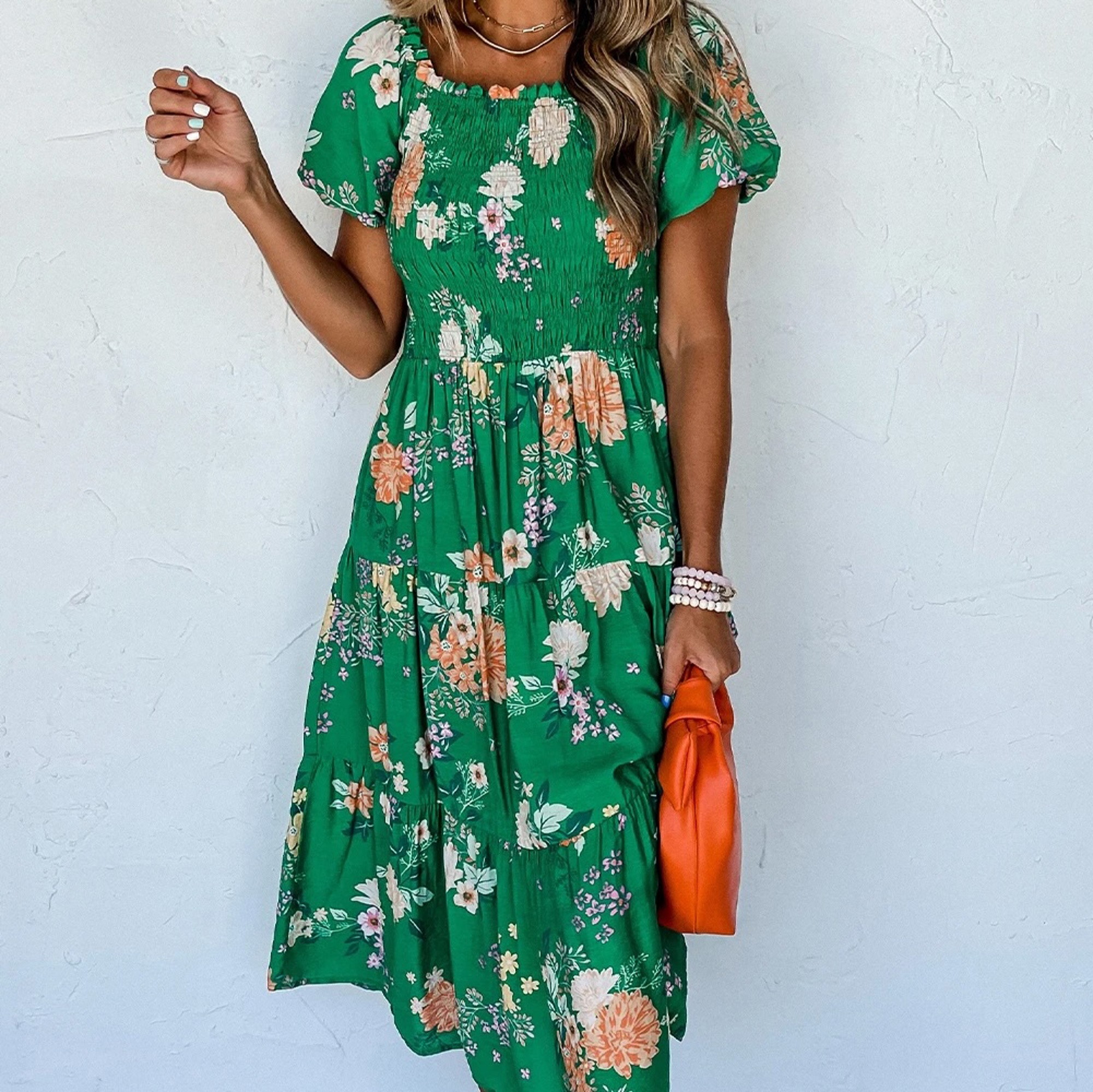 Step into effortless style with this Floral Smocked Tiered Midi Dress. Featuring a fitted smocked waist, it flatters your figure while the high-waist design elongates your legs for a graceful silhouette. Playful bubble sleeves add volume and movement, while the vibrant floral print brings a feminine, romantic touch—perfect for daytime outings or special occasions.