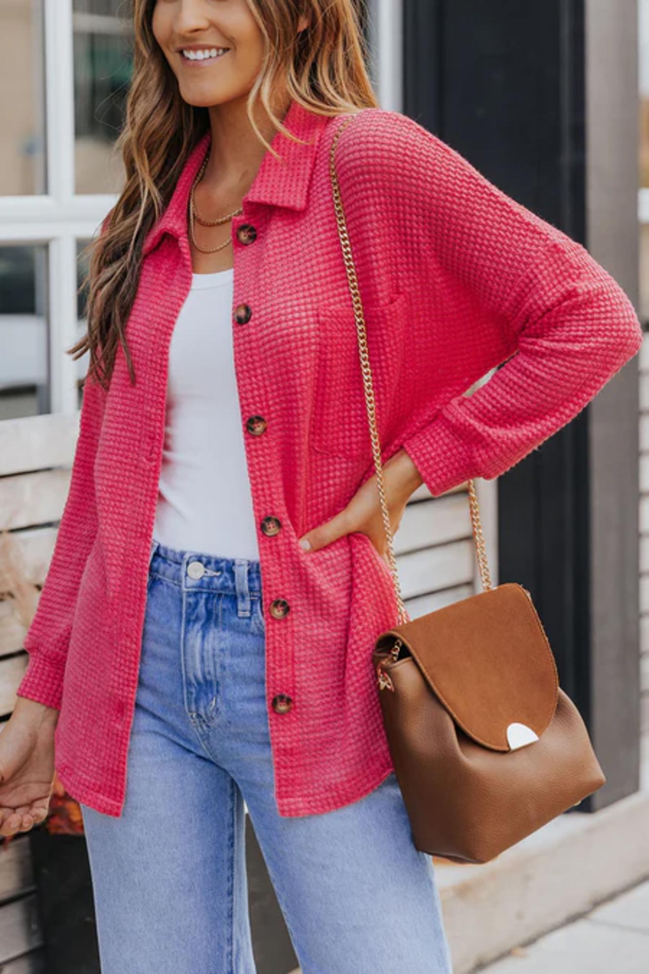 Embrace a casual yet charming look with this textured knit blouse. Constructed from lightweight fabric featuring waffle knit detailing, it boasts a button-up front, collared neckline, drop shoulders, and a single accent chest pocket. The relaxed silhouette is designed with a slouchy feel, culminating in a rounded hemline for added style.