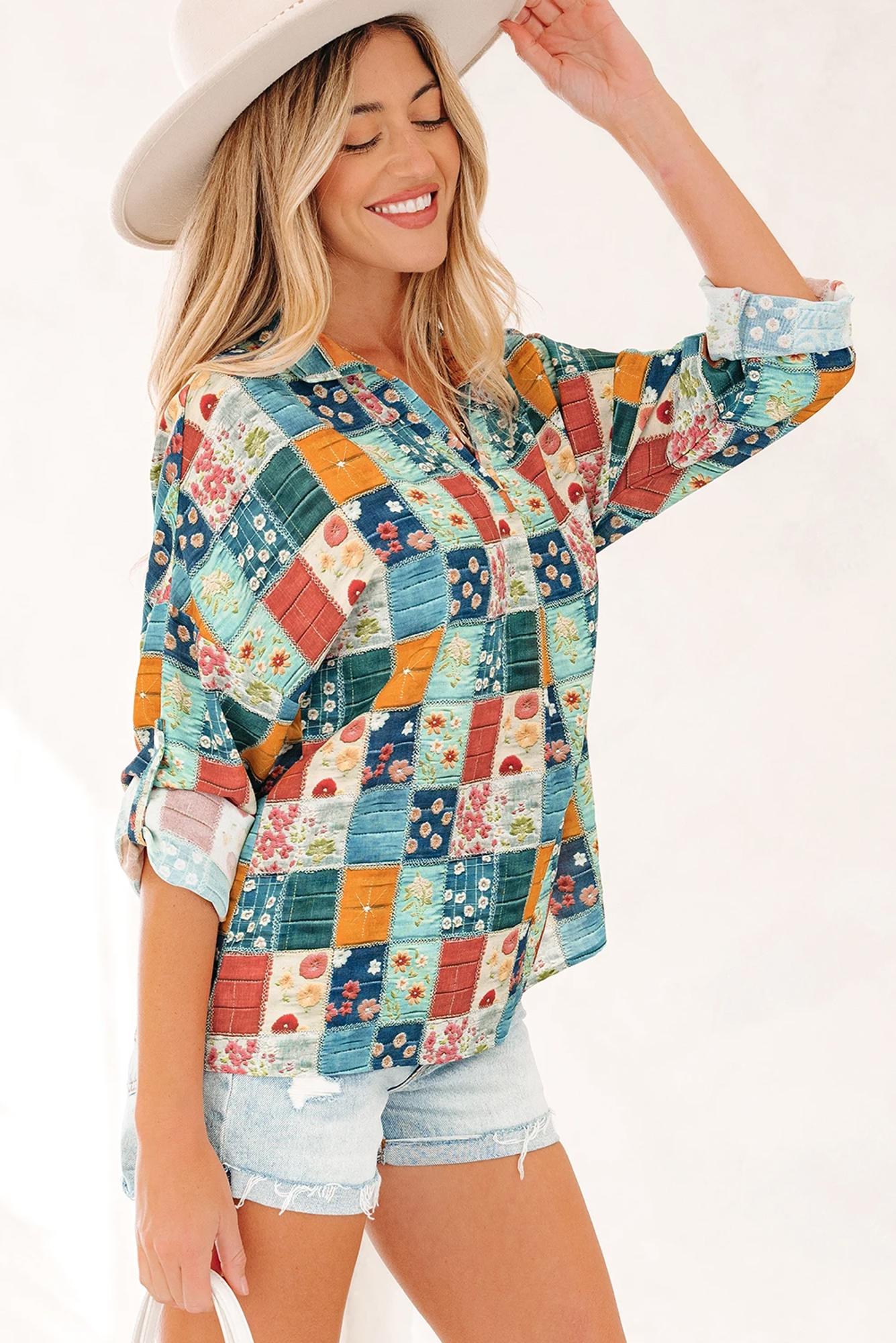 Spring Boho Bloom Print Roll Up Sleeve Blouse | S-XL