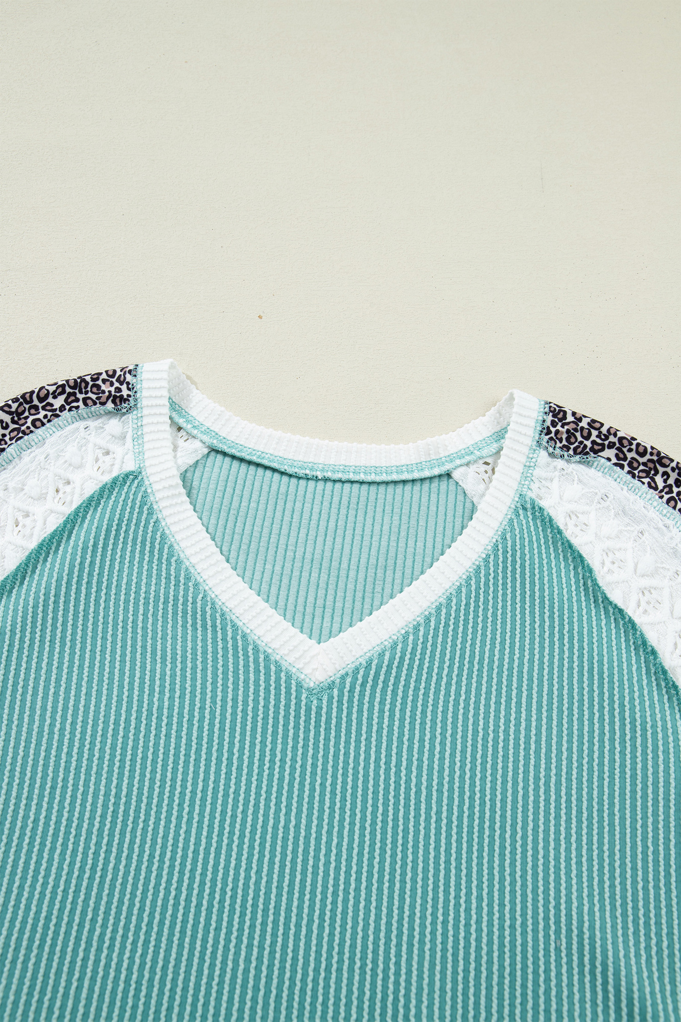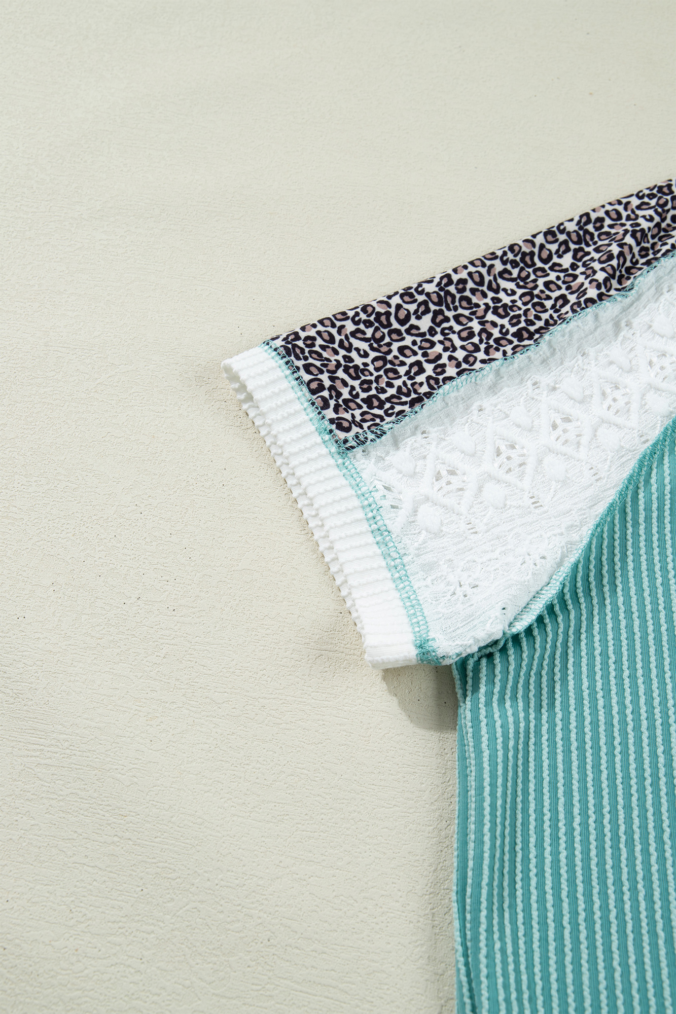 Make a statement in this bold and feminine tee featuring eye-catching lace leopard patchwork. The twisted ribbed fabric adds flattering texture while offering comfortable stretch for an easy, everyday fit. Designed for all-day wear, this ribbed t-shirt blends casual comfort with trendy, modern details that elevate your look effortlessly. Perfect for pairing with jeans or layering under your favorite jacket