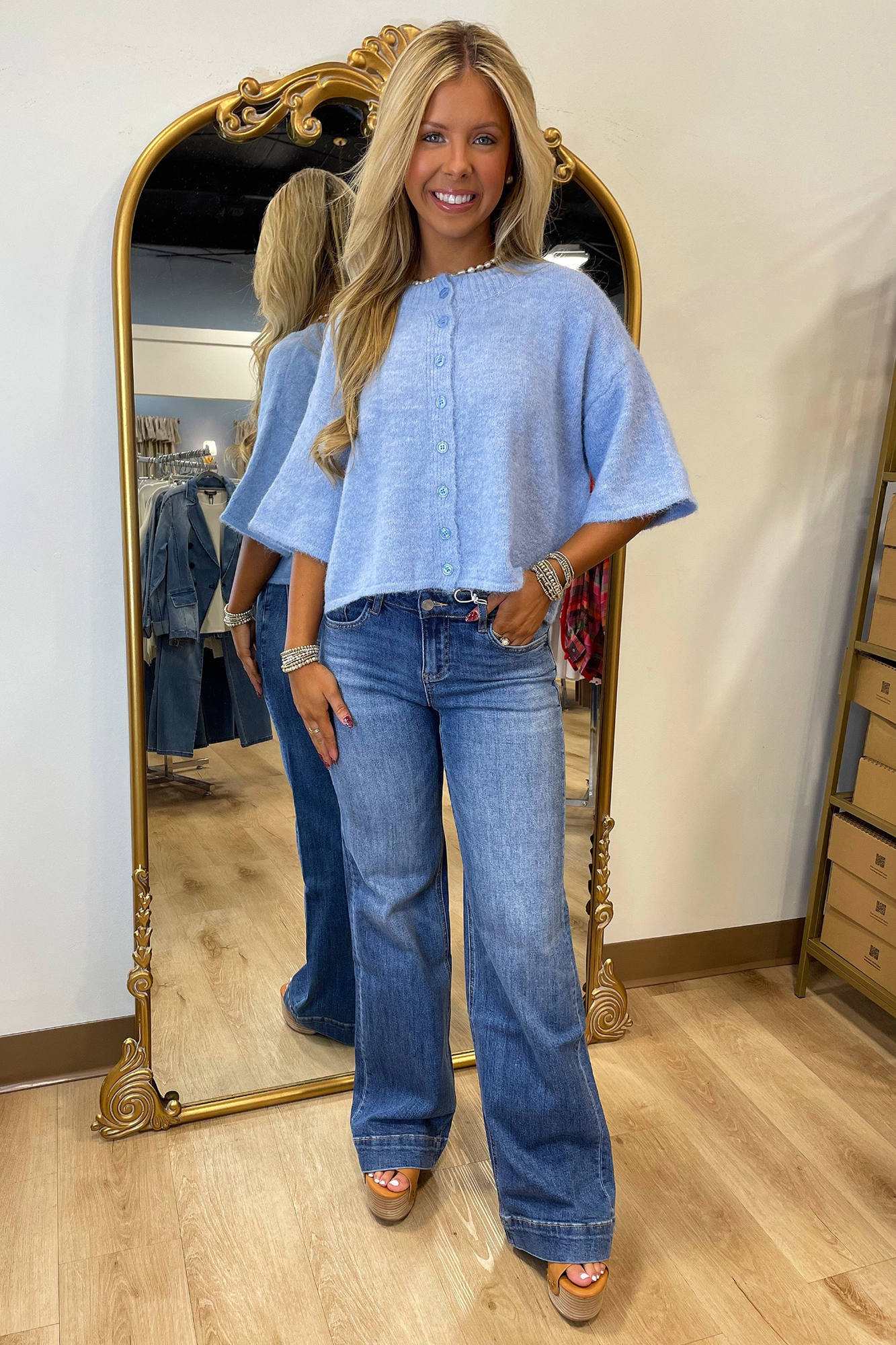 This boxy knit cardigan delivers a relaxed, modern silhouette designed for effortless layering. Featuring 3/4-length sleeves and a soft knit feel, it’s an ideal piece for transitional weather—light enough for spring days yet cozy enough for cooler moments. The classic button-down front adds timeless style and easy wear, making it perfect to dress up or down. Pair it effortlessly with jeans, trousers, or dresses for a chic, laid-back look.