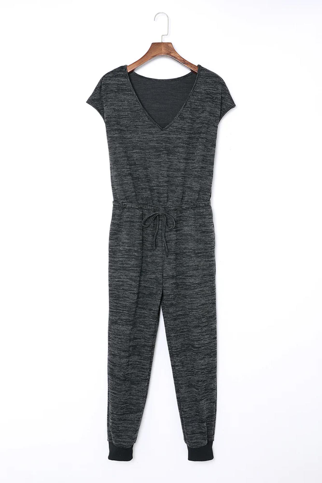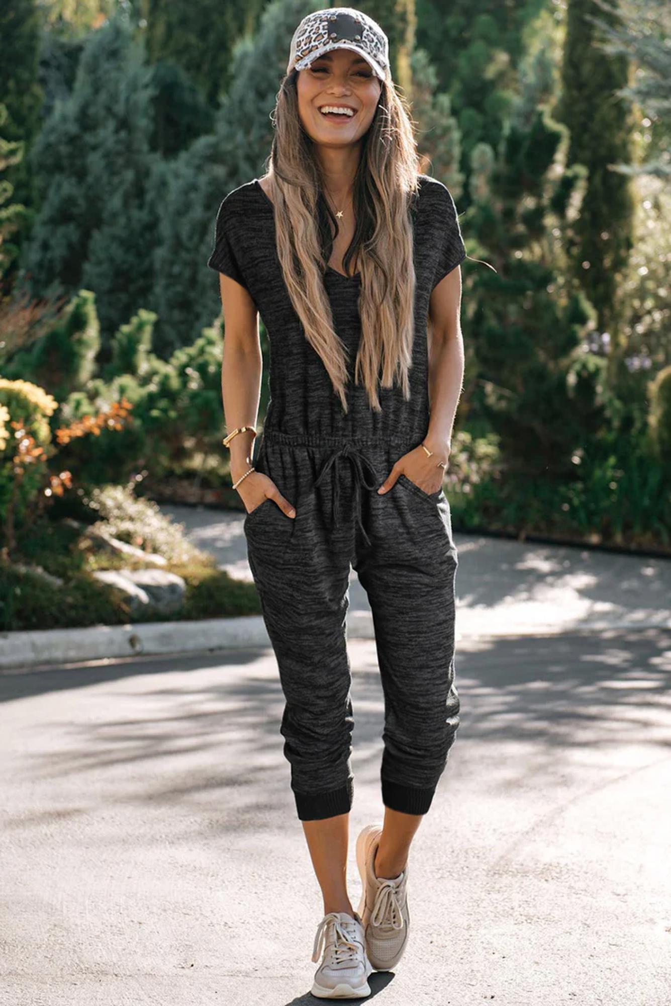 The jumpsuit boasts a stylish and eye-catching heather pattern print, enhancing its overall appeal. Equipped with side pockets, it combines chic aesthetics with practicality, making it a convenient choice for everyday wear. Featuring short sleeves, a v-neck, and a slim-fit design, this jumpsuit is tailored to complement and flatter the feminine figure. The drawstring high waist adds a perfect touch to accentuate women's slender waistlines.
