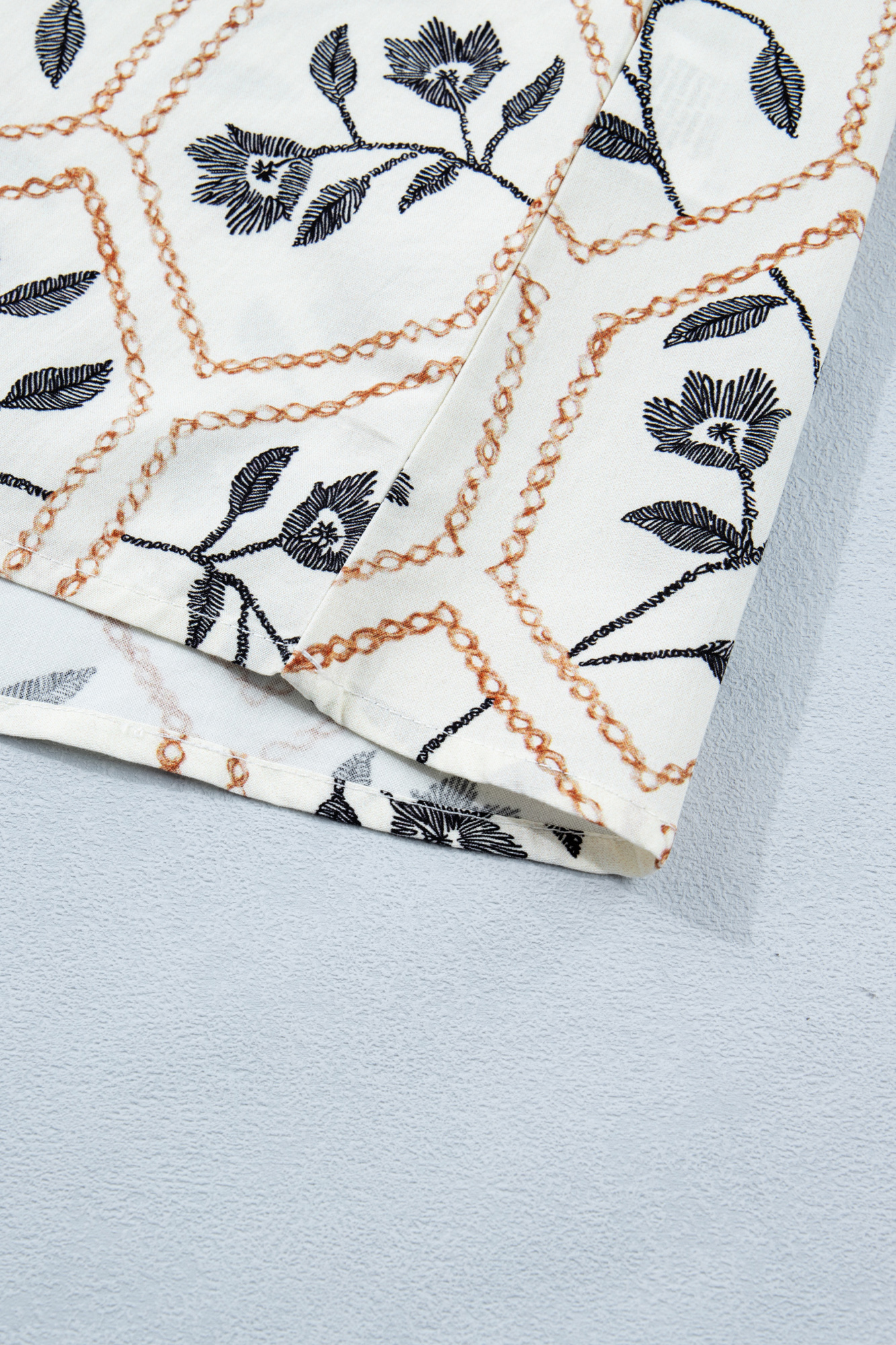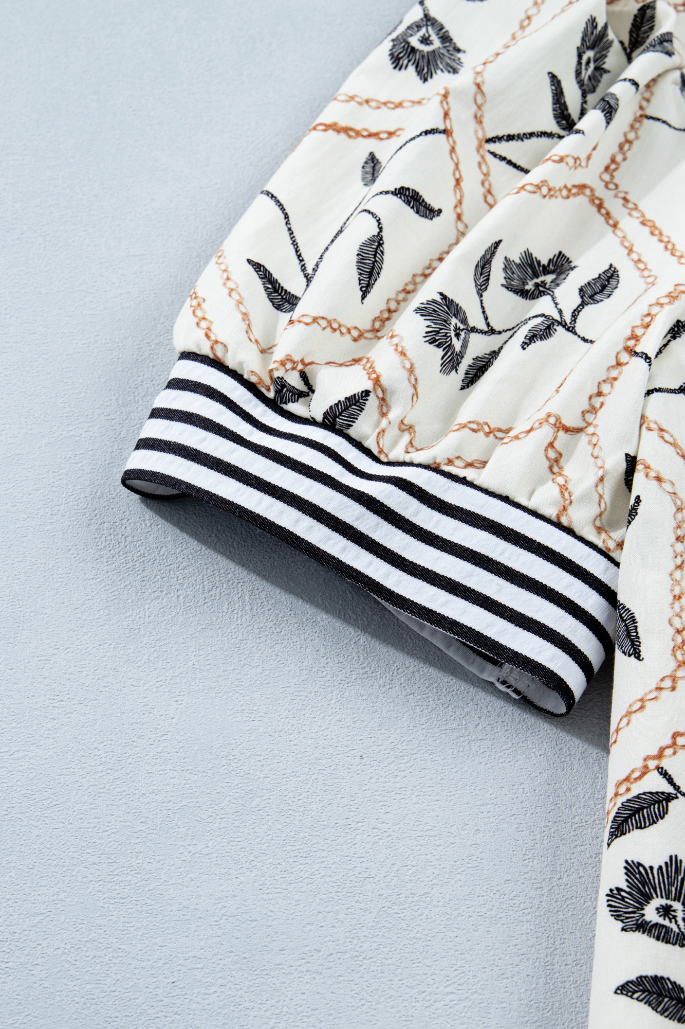 This short sleeve blouse features an all-over blend of floral geometric prints for a fresh, eye-catching silhoutte. A ruffled neckline and puff sleeves accented with striped details add playful charm and feminine flair. Designed with a relaxed, comfortable fit that flatter most body shapes, this printed blouse makes it effortless to elevae your spring/summer outfit. Perfect for casual days, brunch dates or vacation style.