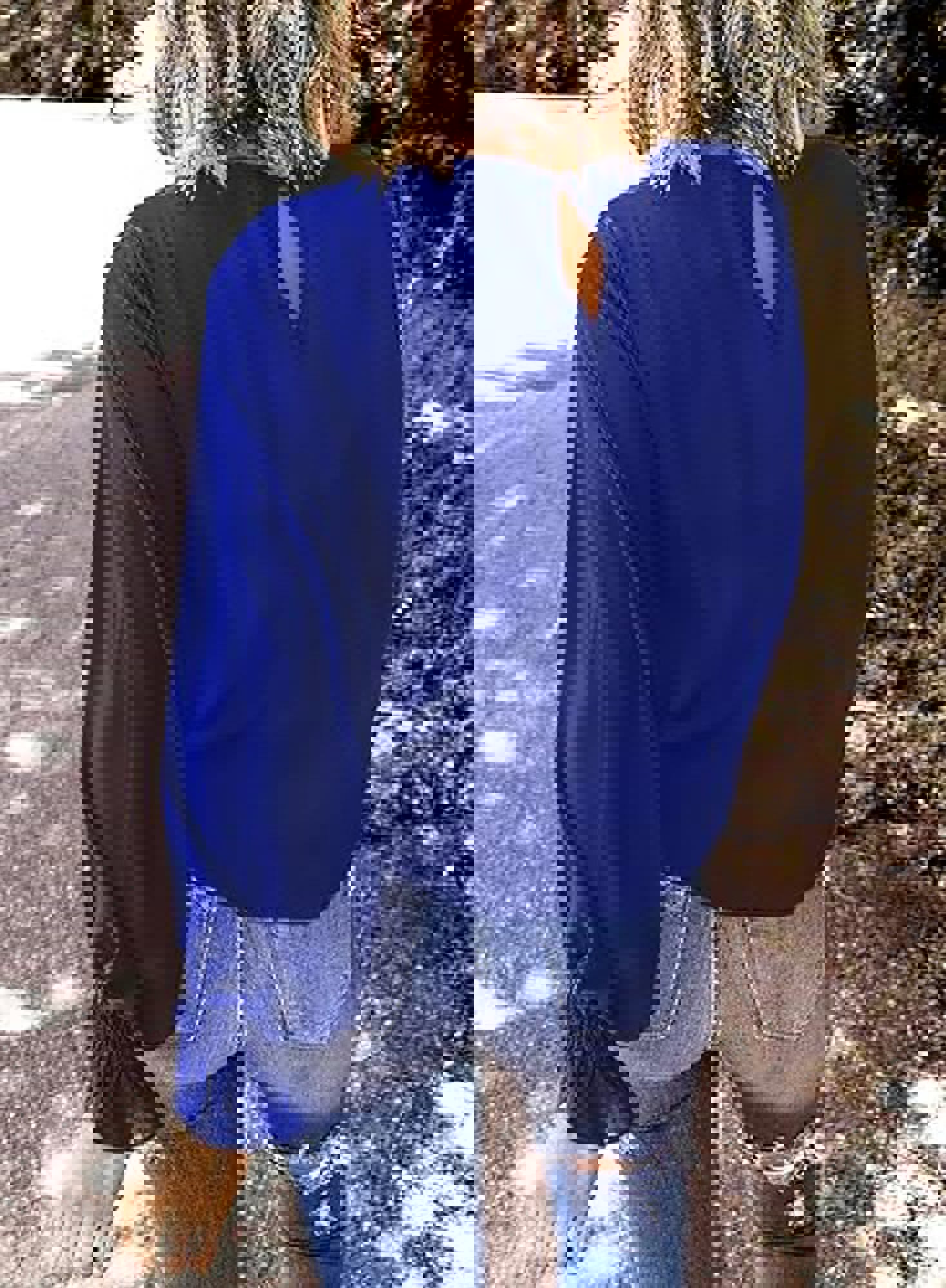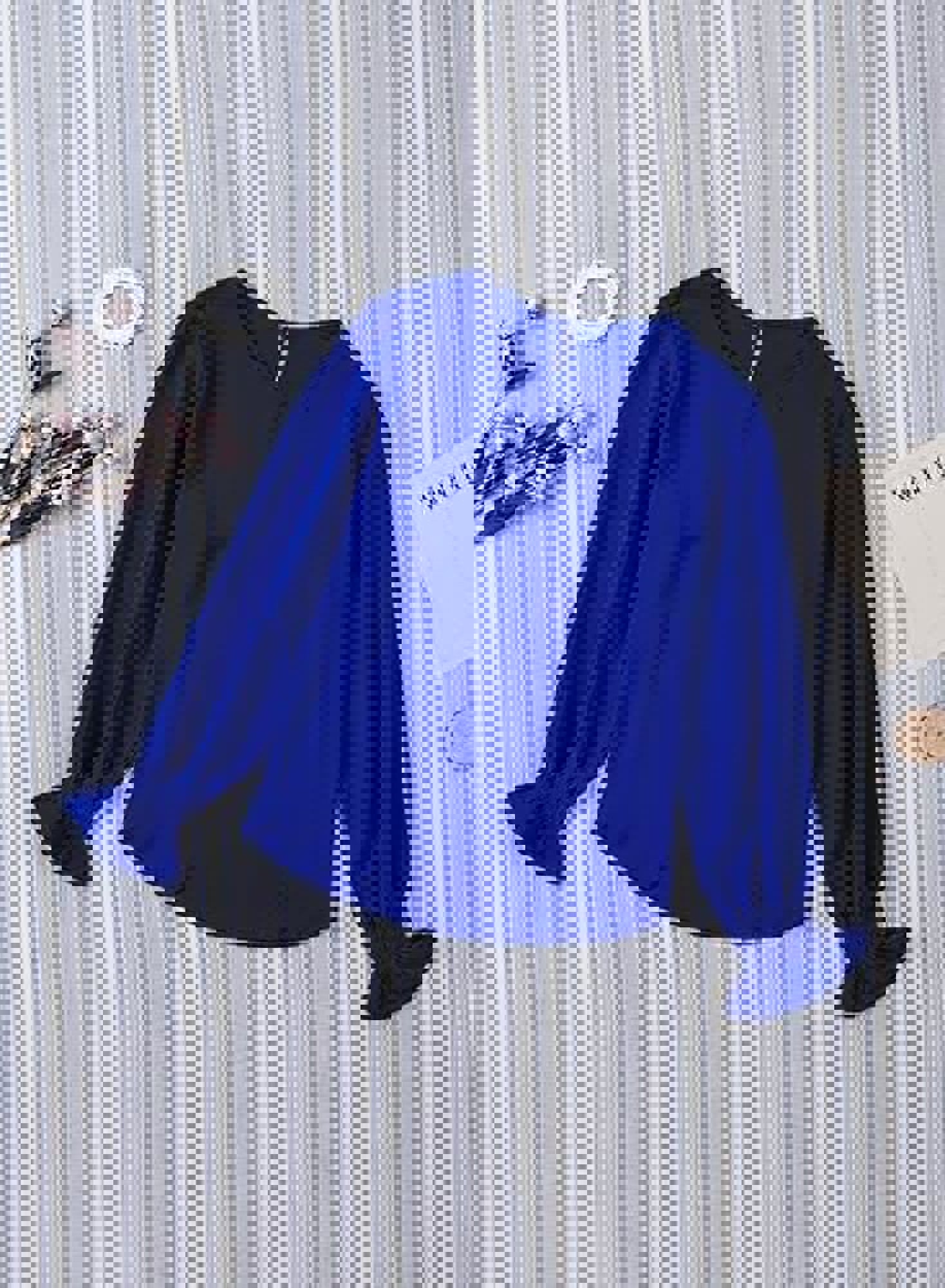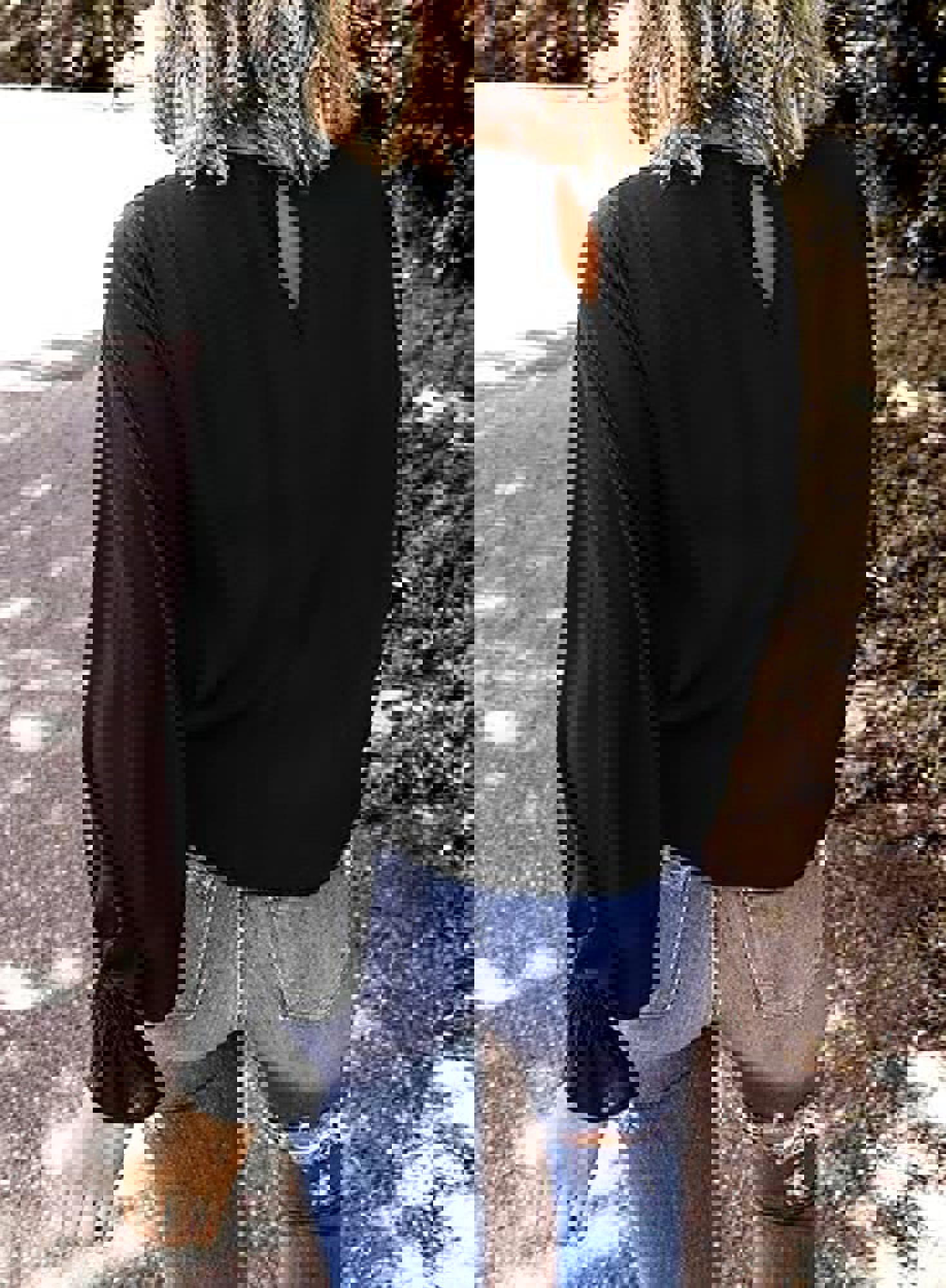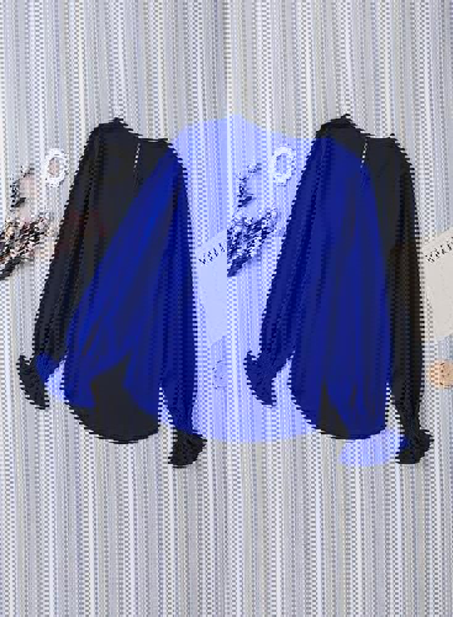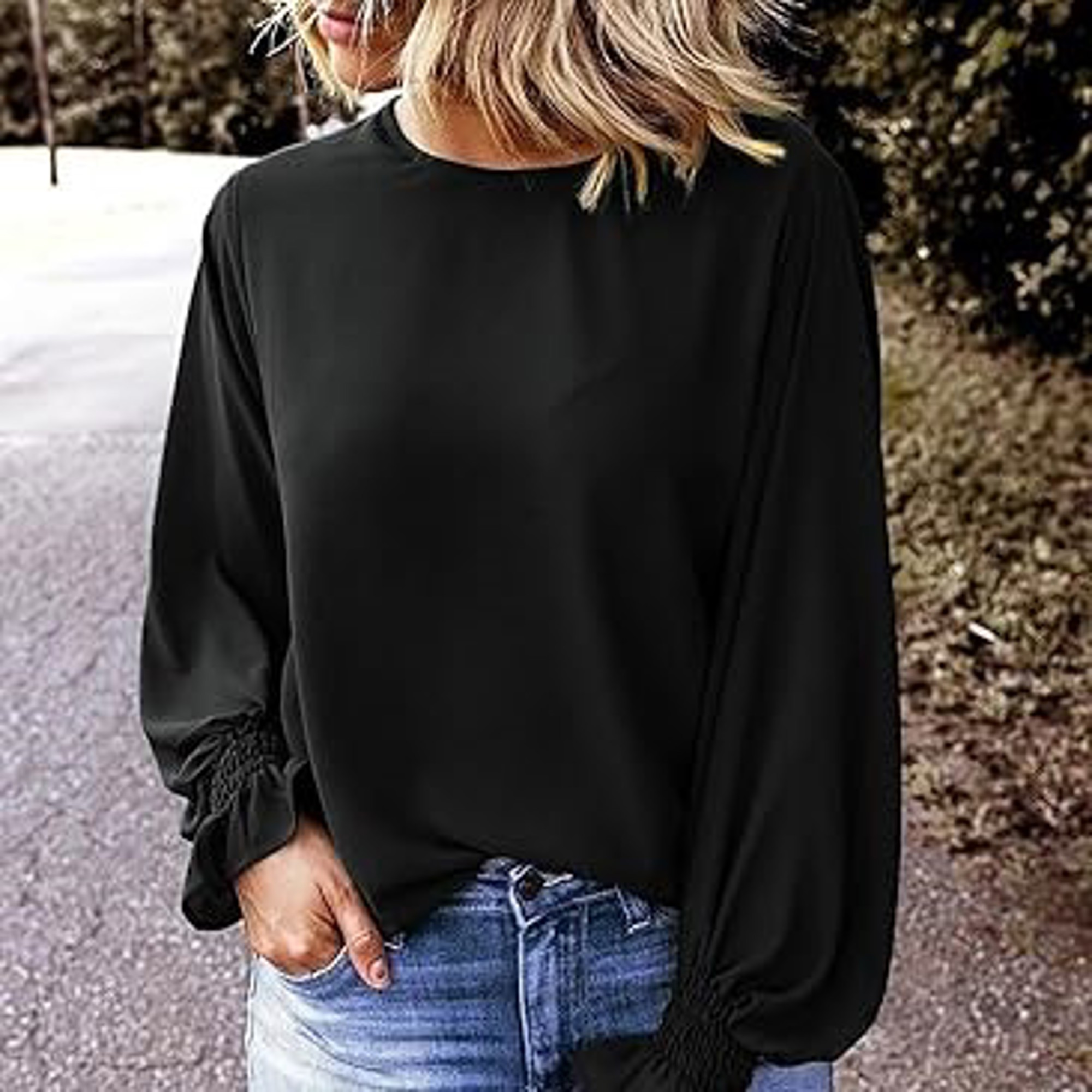 This long-sleeve top is a foolproof choice. It features a round neck, loose fit, and bubble sleeves with ruffled cuffs for a timeless look. The solid color and concise style make it a classic piece that pairs well with any jeans or skirts, showcasing its versatile style.