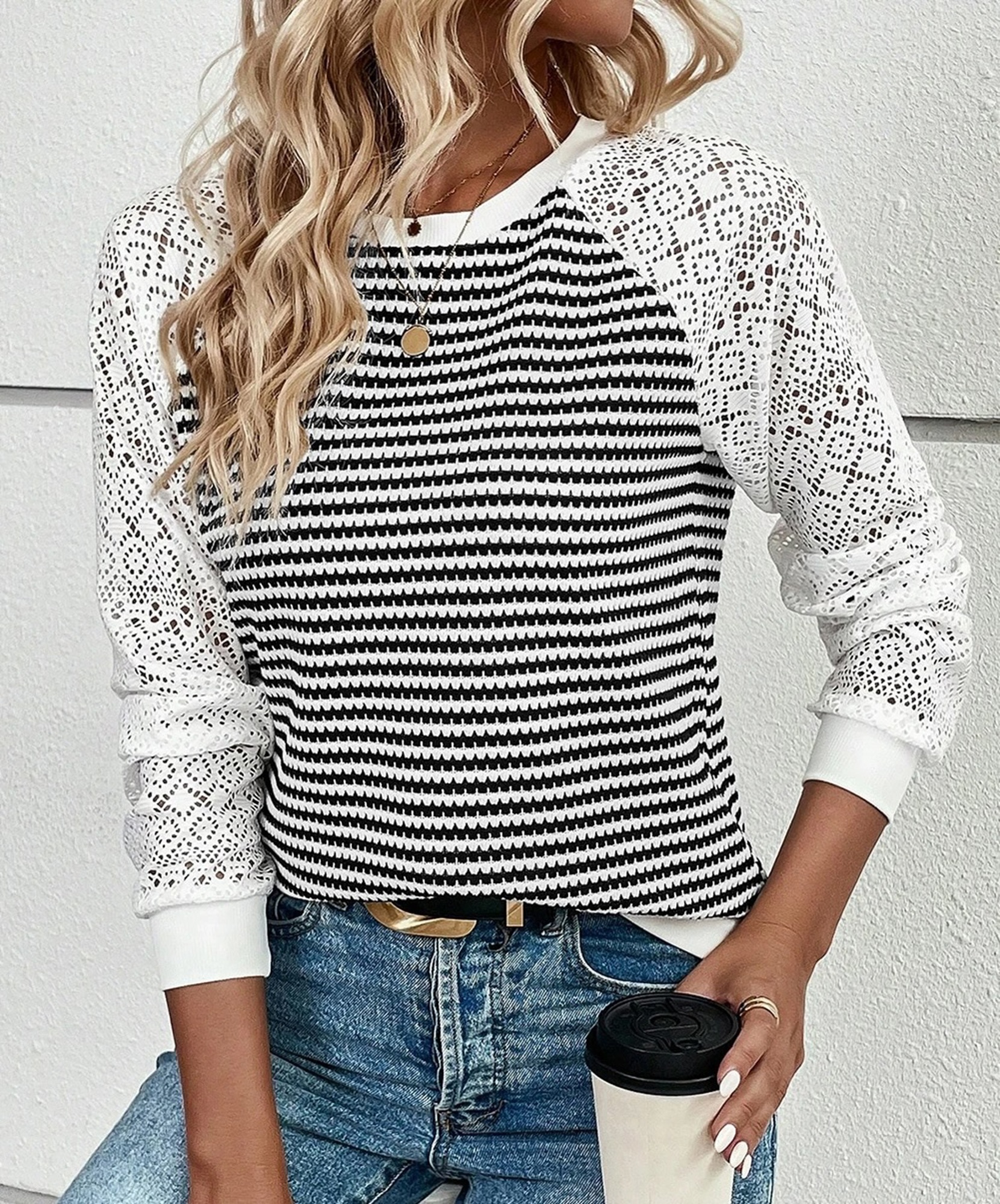 Elevate your everyday style with this chic knit top, designed to balance comfort with sophistication. The striped textured knit fabric brings cozy dimension, while contrast hollowed lace patchwork adds a touch of delicate elegance. Long sleeves provide graceful coverage and breathable comfort, making it perfect for year-round wear. Finished with unique patchwork detailing, this fashion-forward statement piece is ideal for creating effortlessly stylish looks, whether dressed up or down.