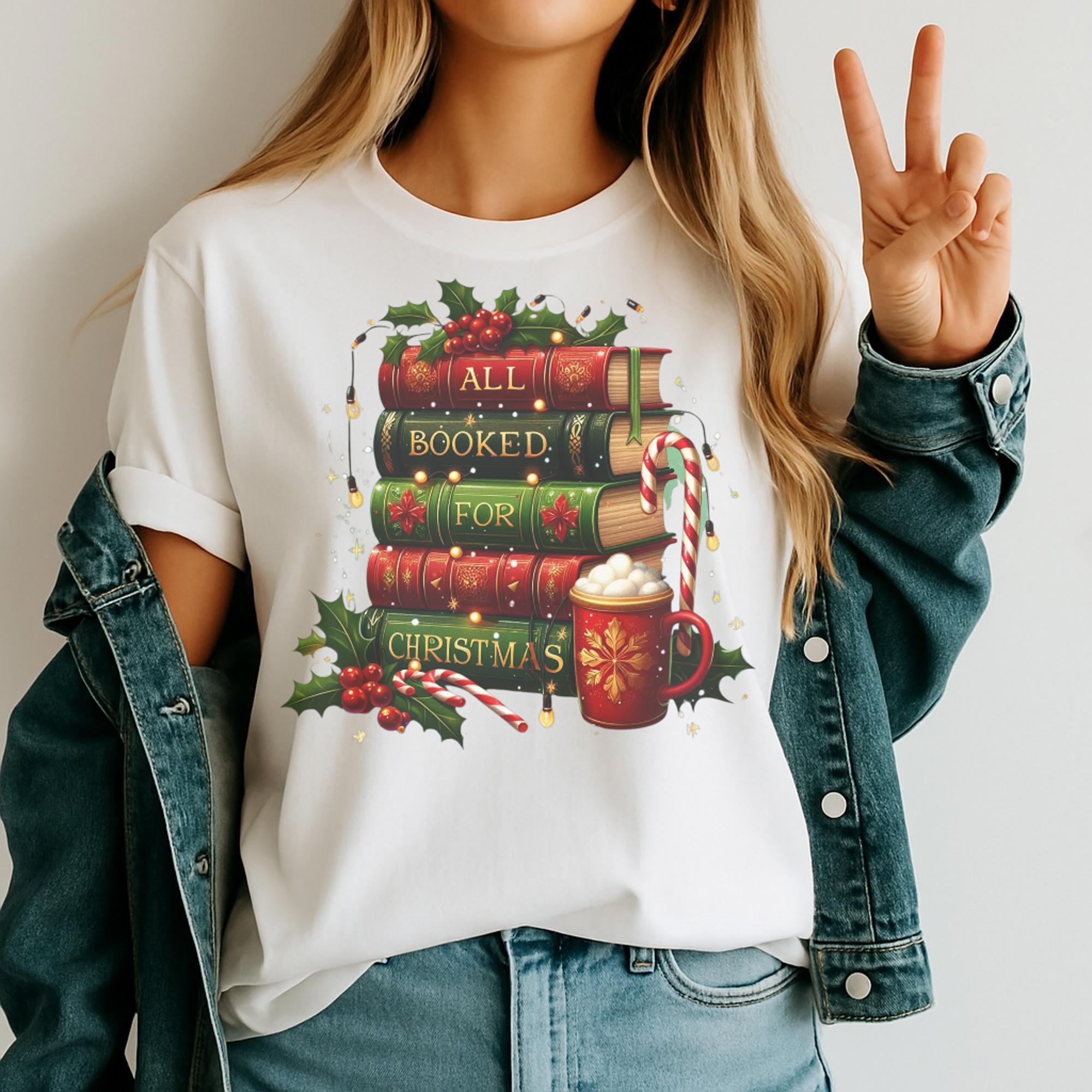 All Booked for Christmas – Cozy Book Lover Holiday Graphic Tee, Reading Gift Shirt, Festive Mug & Candy Cane Book Stack Top