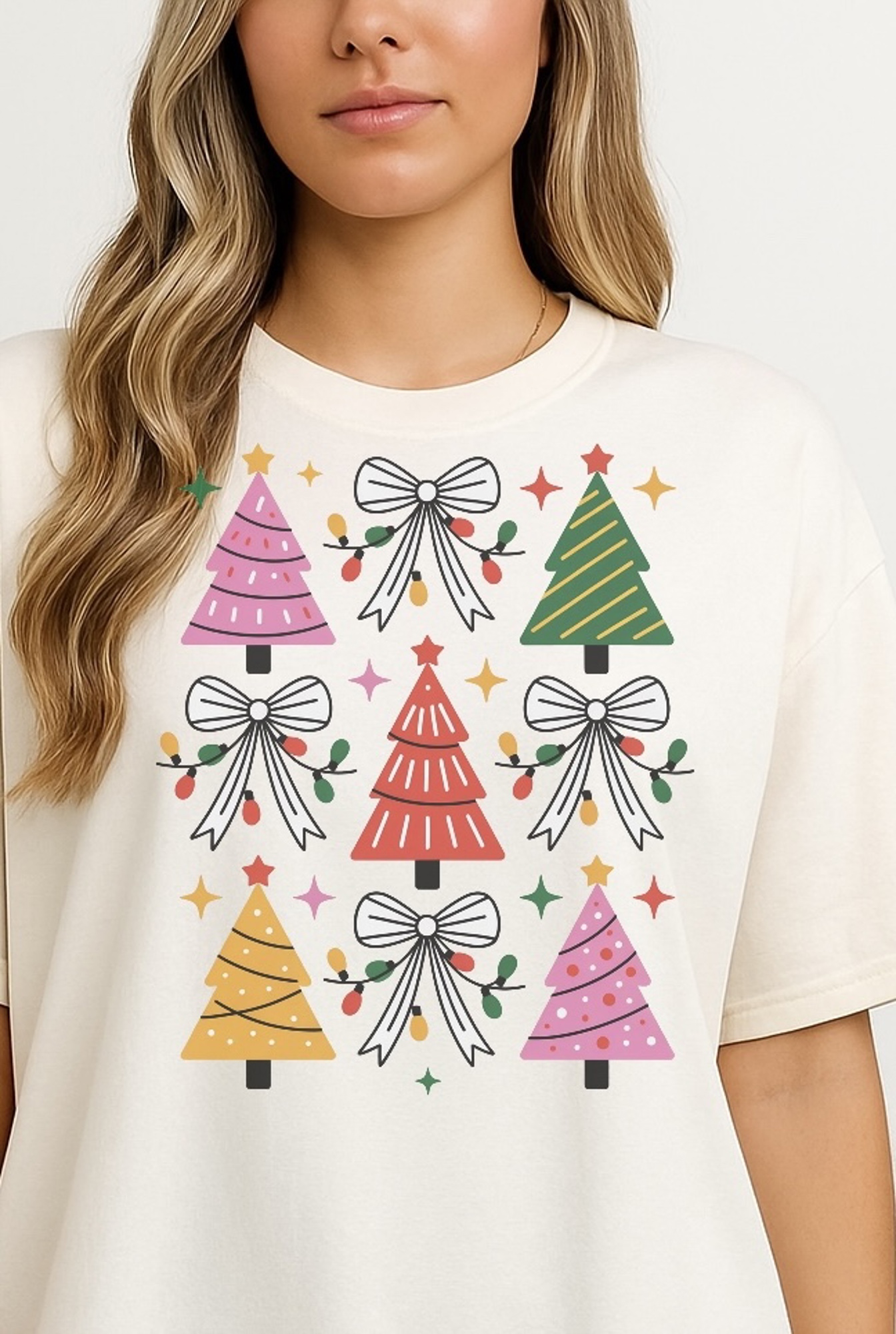 Christmas Lights Coquette Bow Trees Graphic Tee – Retro Pastel Holiday Shirt, Cute Festive Aesthetic Top for Women, Merry Christmas Outfit Idea