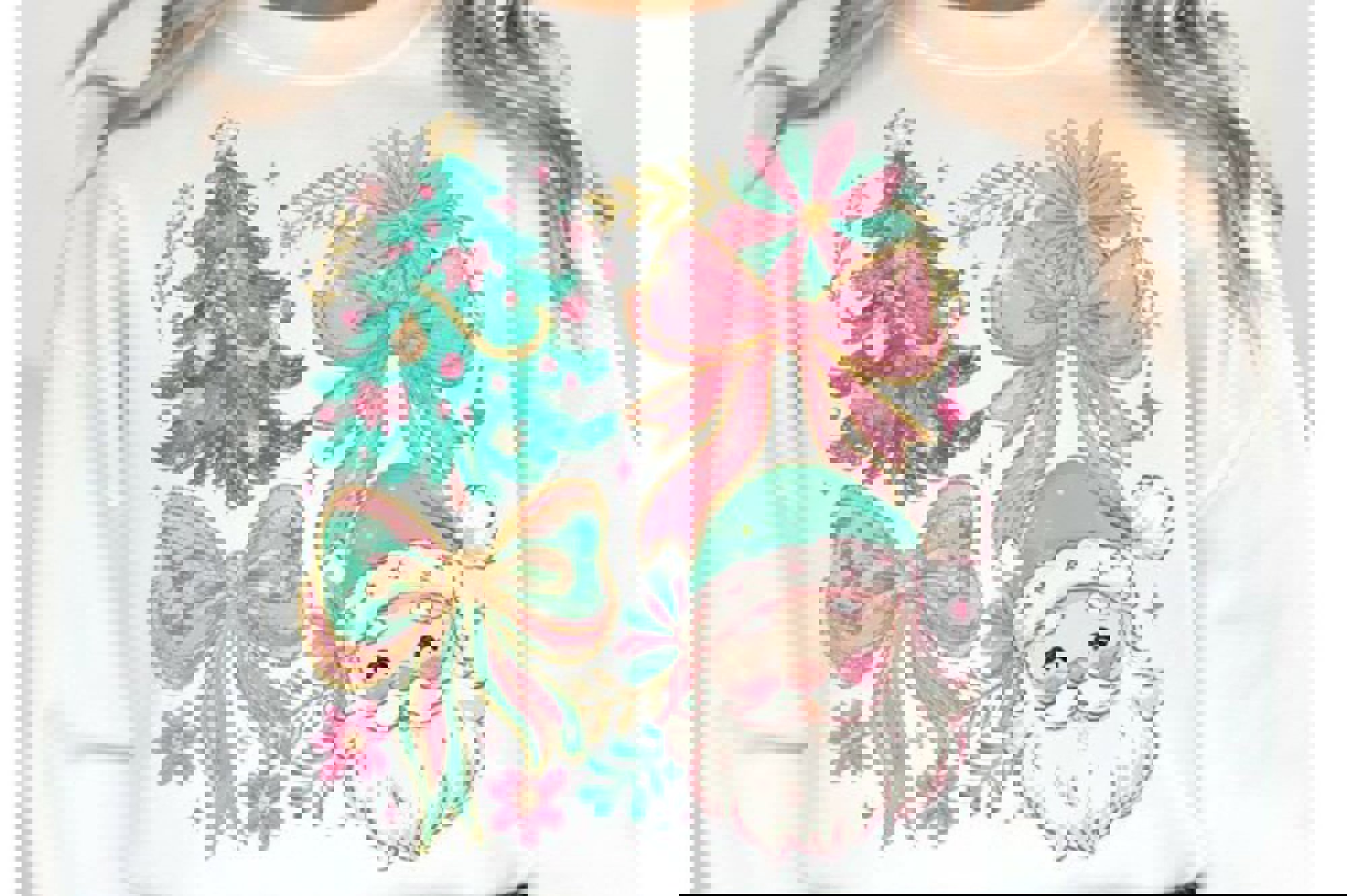 Floral Preppy Christmas Coquette Bow - Pastel Holiday Crew Neck Sweatshirt, Cute Pink and Teal Santa Top, Girly Festive Tree Shirt, Christmas Gift