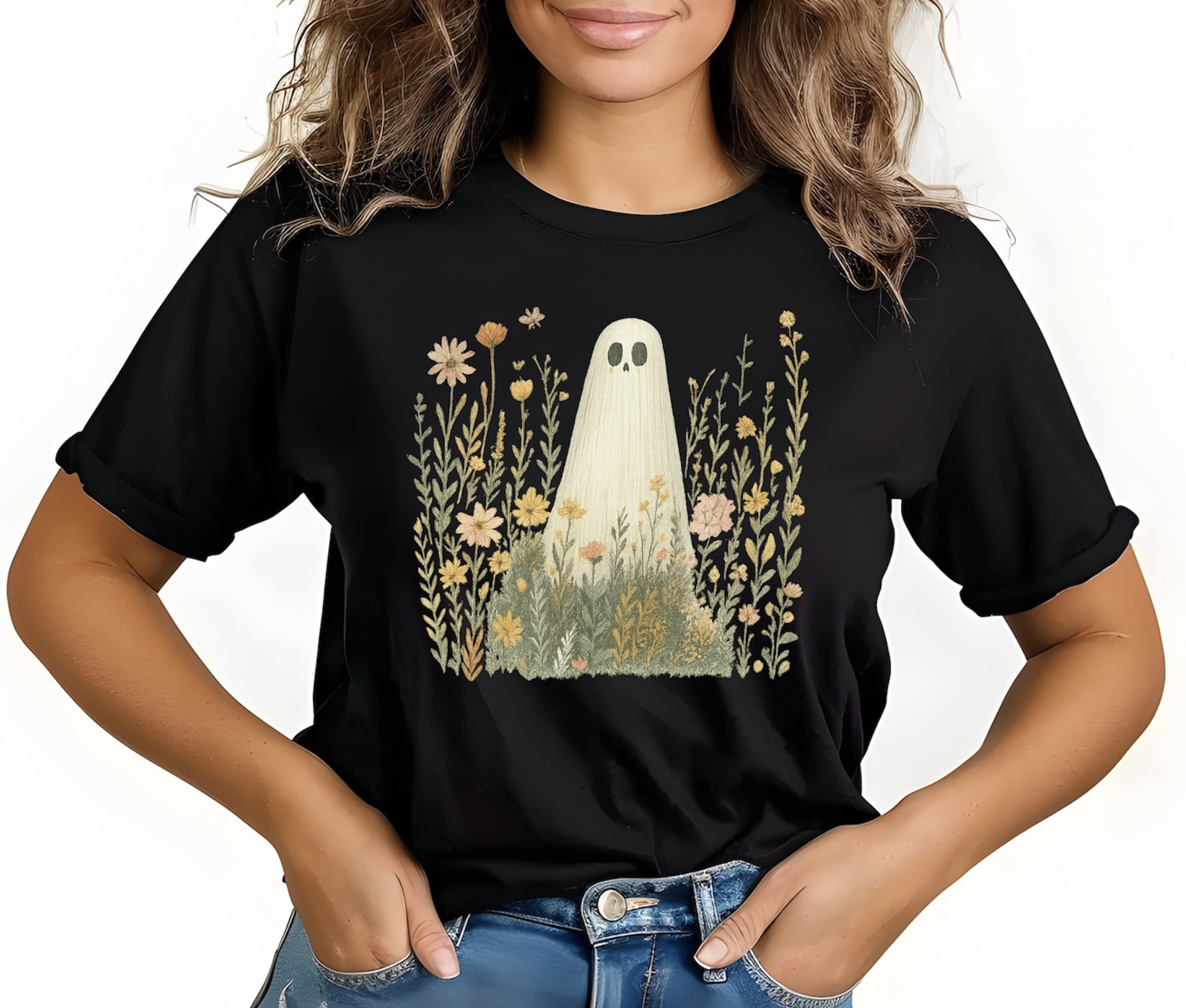 Ghost in Flower Field- Cute Halloween T-Shirt Spooky Floral Ghost Graphic Tee Fall Aesthetic Top Trendy Autumn Outfit for Women