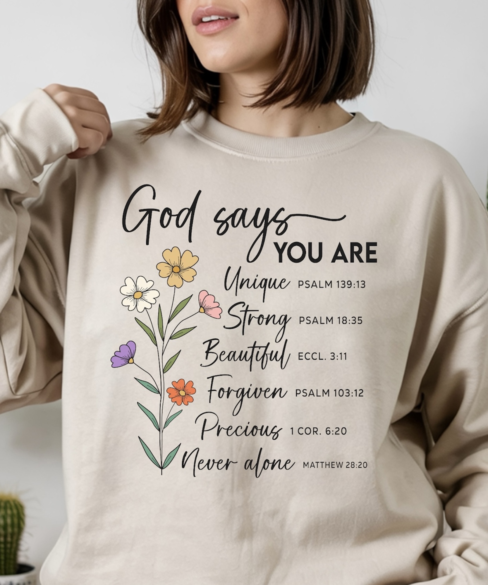 God Says You Are Flower - Christian Inspirational Crew Neck Sweatshirt, Bible Verse Floral Faith Top, Encouraging Scripture Shirt, Religious Gift for Women