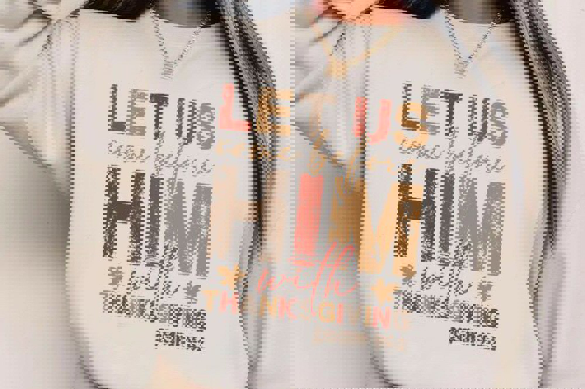 Let Us Come Before Him with Thanksgiving - Christian Fall Crew Neck Sweatshirt, Faith Scripture Top, Psalm 95:2 Bible Verse Shirt, Grateful Autumn Outfit