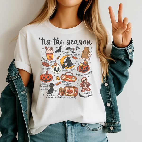 Halloween Doodles Graphic Tee Cute Spooky Season Shirt with Pumpkins, Witches, Ghosts Fall Vibes