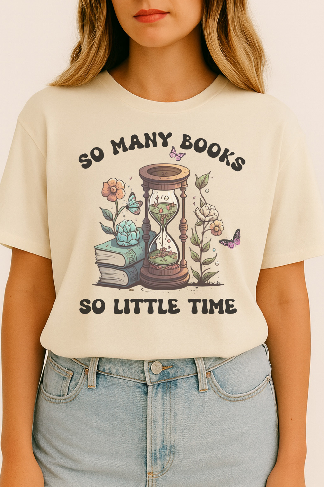So Many Books So Little Time- Book Lover Graphic Tee Cute Vintage Reading Shirt with Hourglass Flowers, Literary Gift for Women