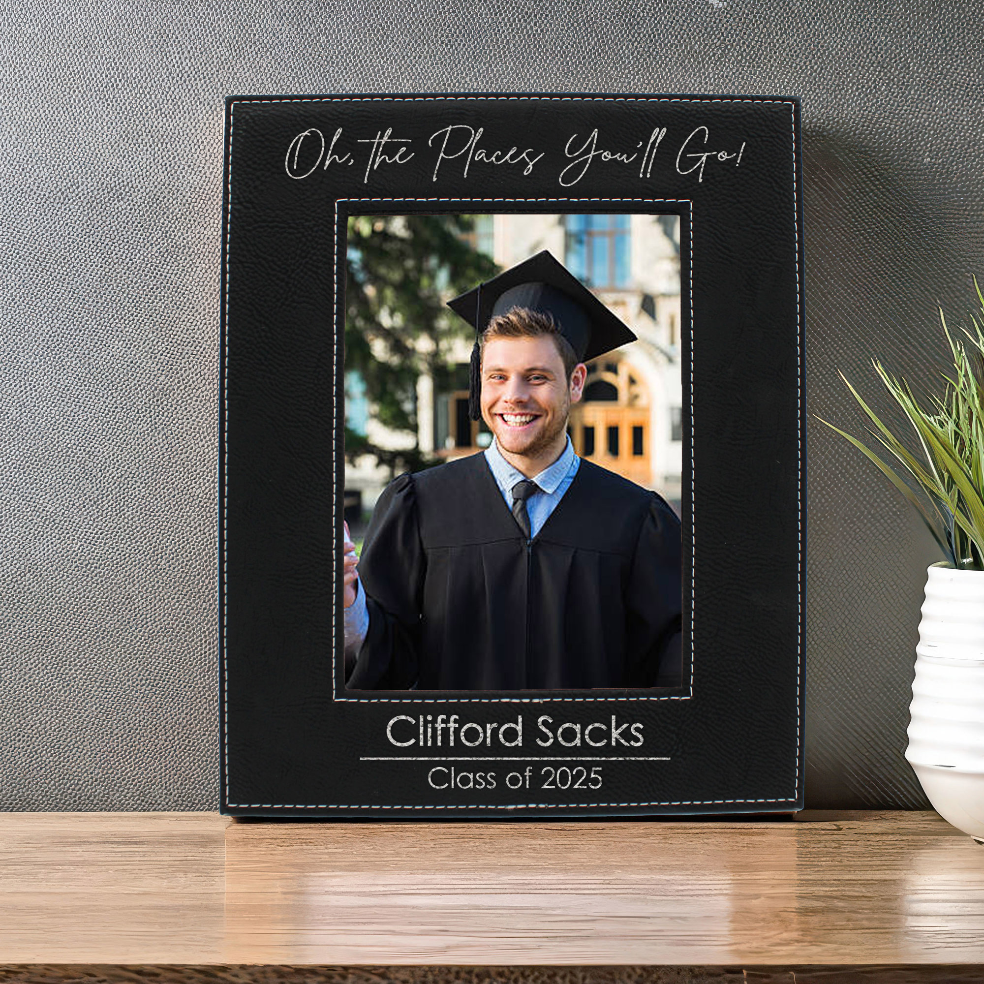 Celebrate your graduate's remarkable achievement with this personalized picture frame designed specifically for the Class of 2025. This custom photo display creates a lasting memento of their graduation day, featuring space for a cherished photograph that captures this milestone moment. The frame's design allows for personalization, making it a thoughtful and meaningful gift that the graduate will treasure for years to come. Perfect for displaying on a desk, shelf, or wall, this frame serves as both a sophisticated decoration and a reminder of their academic accomplishments. The frame's classic styling complements any decor while keeping the focus on the graduate's special moment. A wonderful way to commemorate graduation day, this custom frame makes an ideal gift for high school or college graduates, helping them preserve their memories in style.