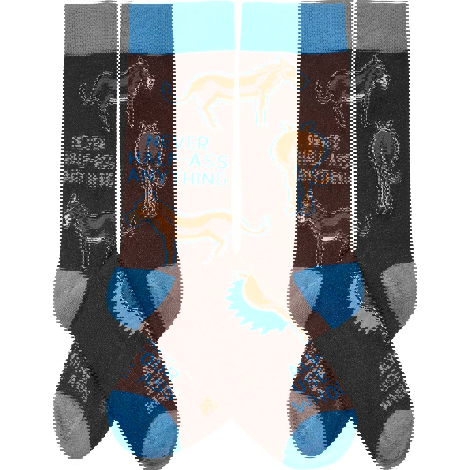 A pair of colorful woven socks displaying hand illustrated designs of donkeys with sentiments that read "Never Half-Ass Anything - Always Use Your Whole Ass." Socks feature a one size fits most design made with cotton, nylon, and spandex.