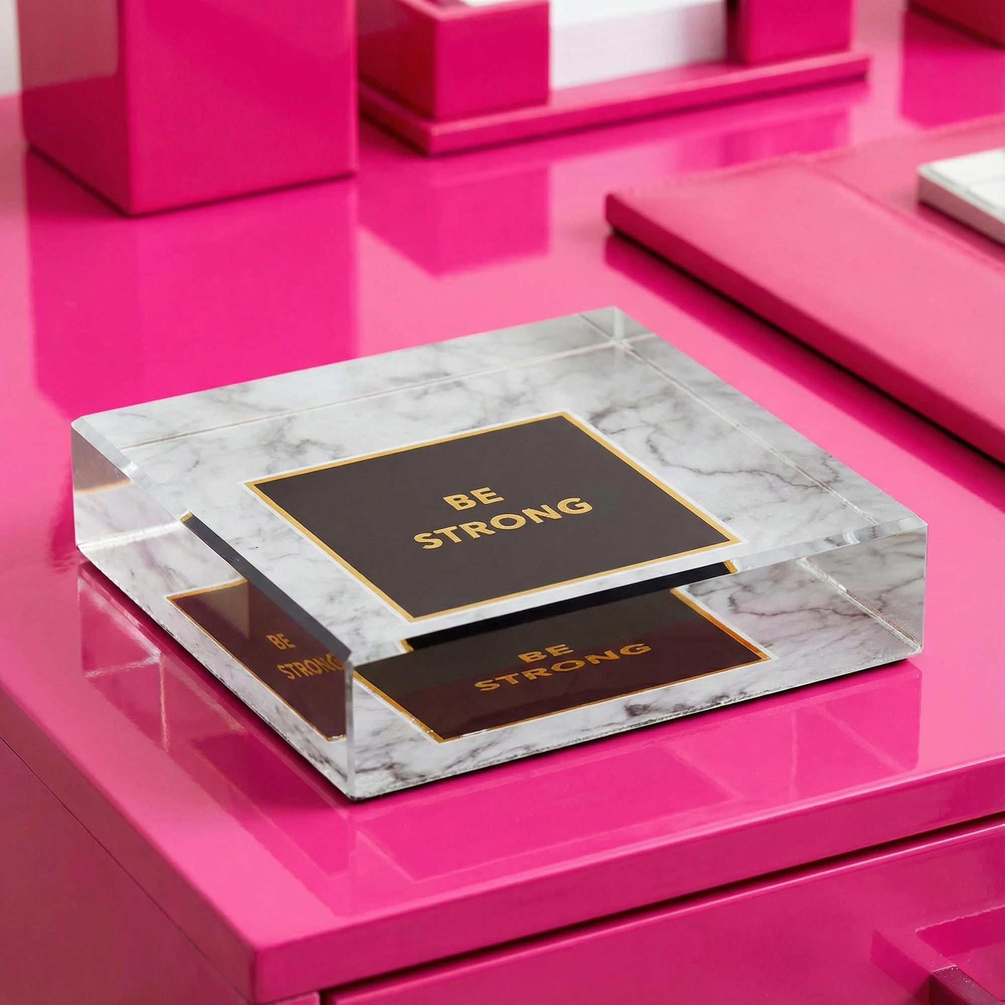 Square glass paperweight featuring 'Be Strong' in metallic gold text.