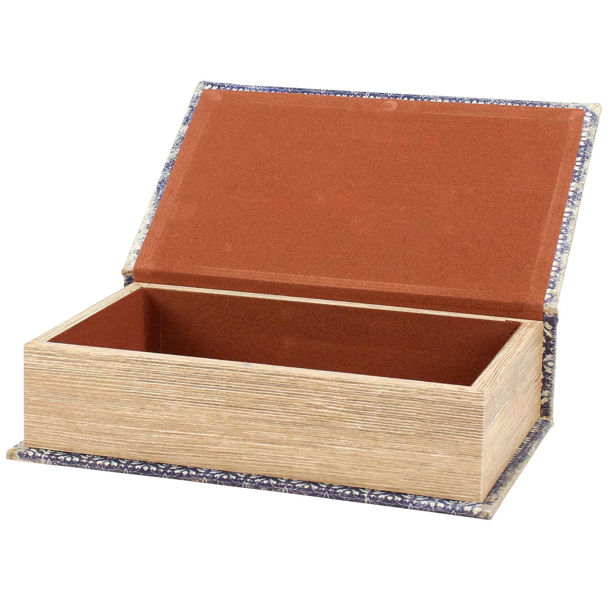 This Blue Medallion book box can be used upright on a bookshelf or laid flat with the cover open displaying decorative accents inside.