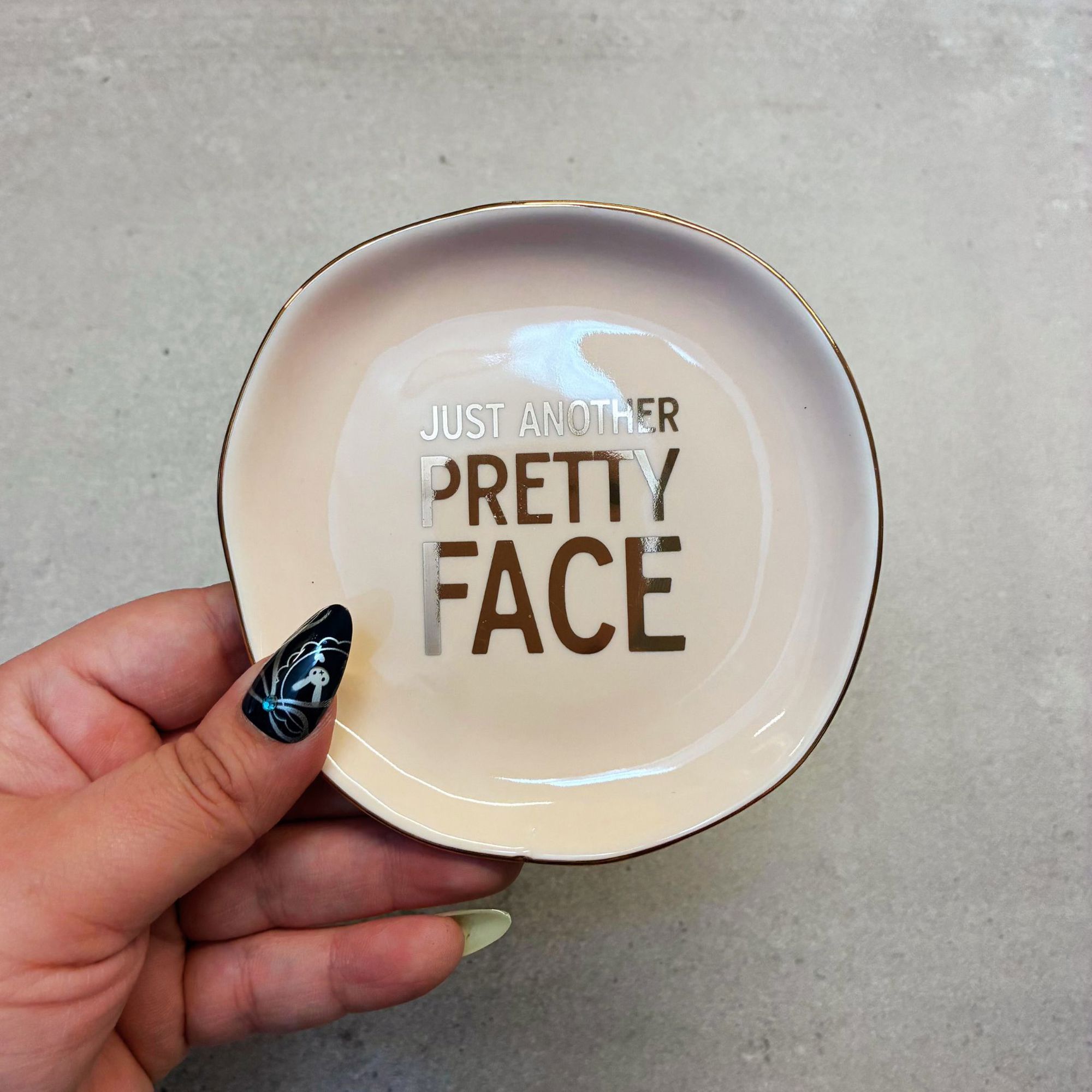 Ceramic tray reads: "Just Another Pretty Face" in gold print on blush pink ceramic with a gold rim