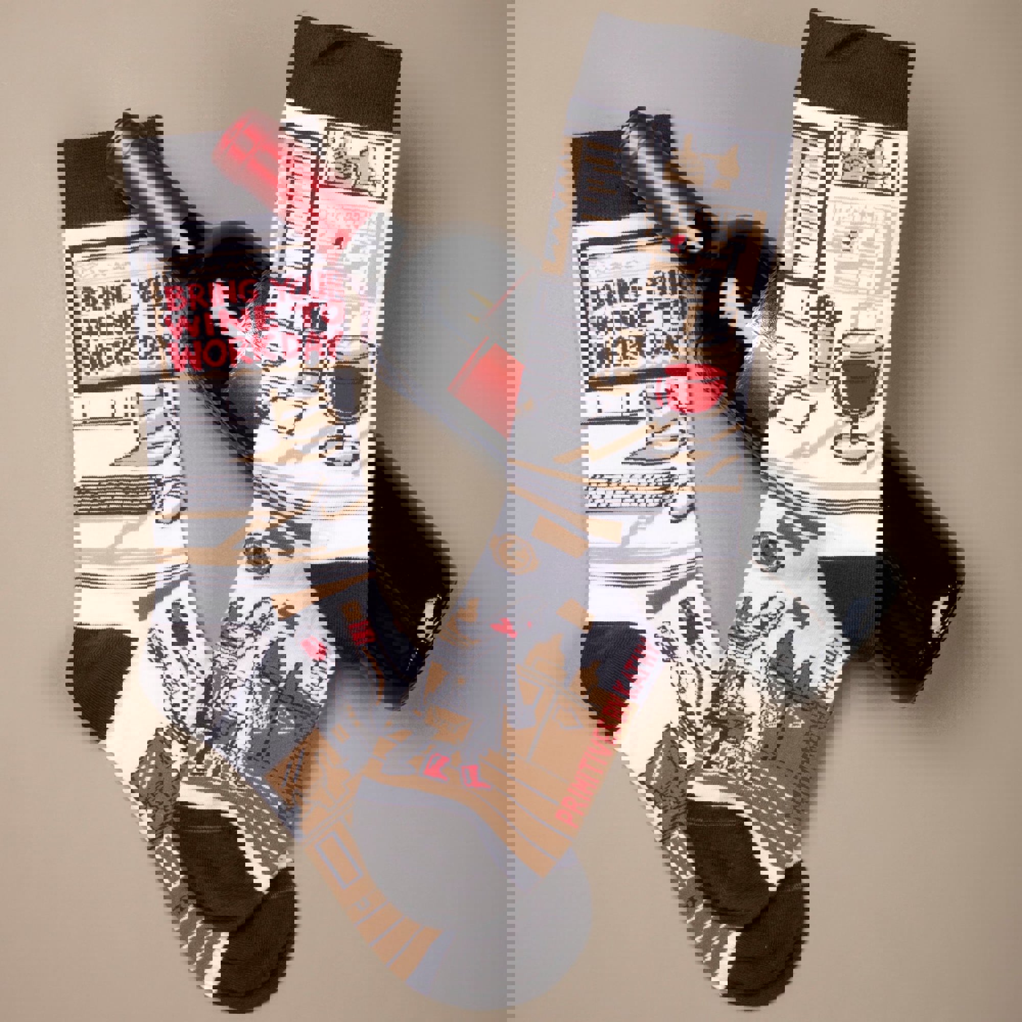 Colorfully printed socks reading "Bring Your Wine To Work Day" take the sentiment literally, with a professionally-dressed wine bottle jetting off to work, also holding ... more wine.