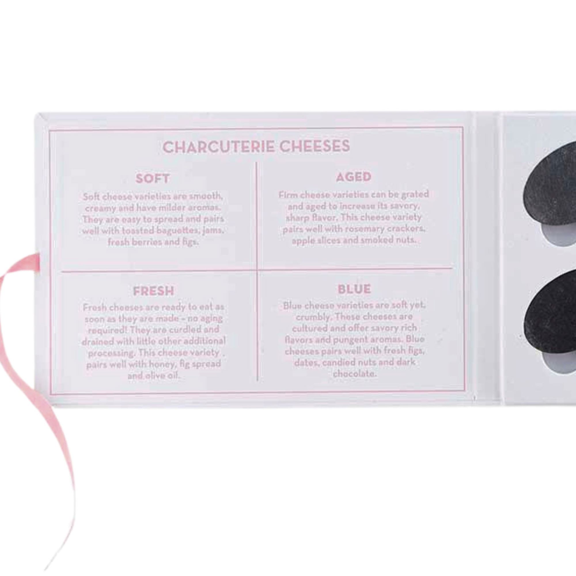 Set includes: 6 slate cheese markers and chalk pen in a book-style gift box that ties with pink ribbon. Absolutely ready to gift!