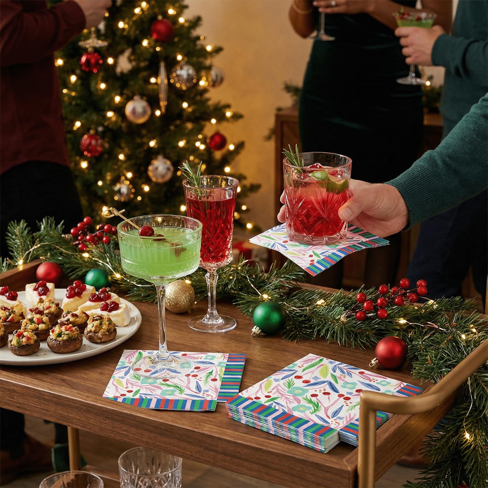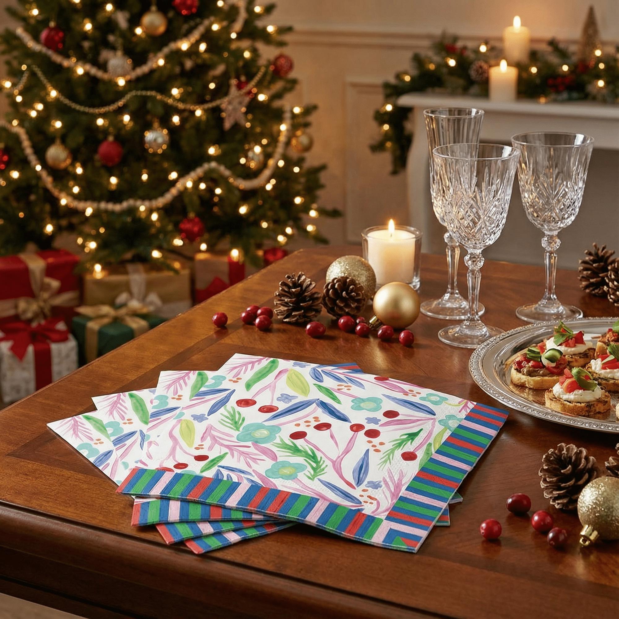Christmas Foliage Fringe Beverage Napkins | Party Cocktail Paper Napkin | 5"